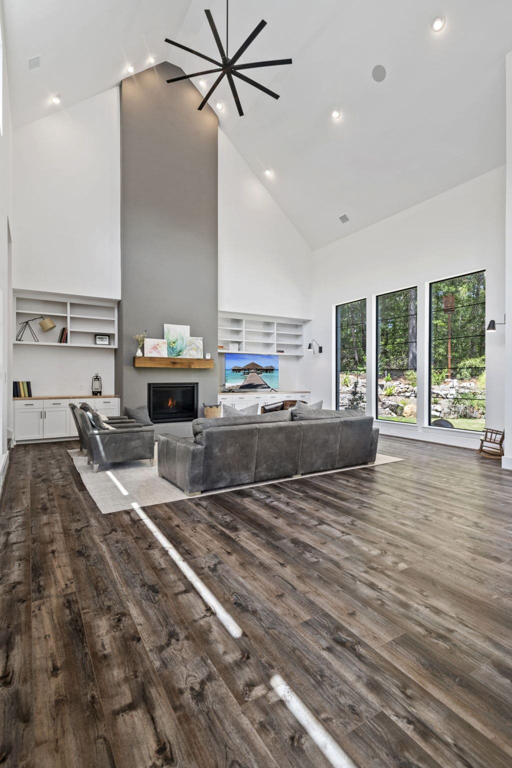 Big windows, built-in shelves, and a sleek gas fireplace with a wood mantel
