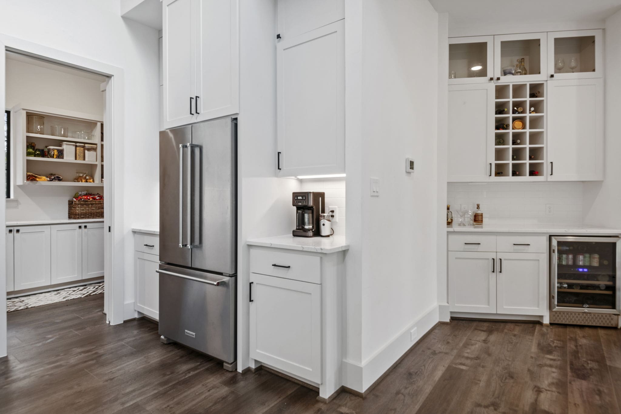 This new home in Crown Ranch features a clean, modern European design. We used two-tone stucco and added large windows for natural light. The vaulted great room includes a sleek gas fireplace. The kitchen stands out with quartz counters and a bold center island. Each bathroom has a spa-like feel with walk-in showers and freestanding tubs that combine comfort and style.