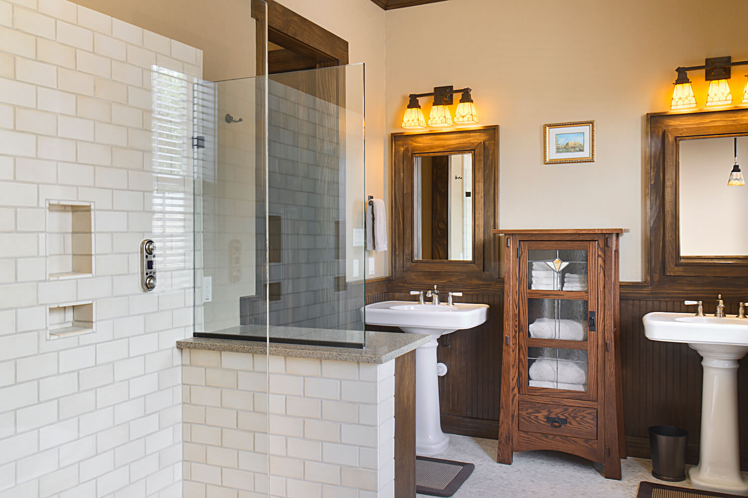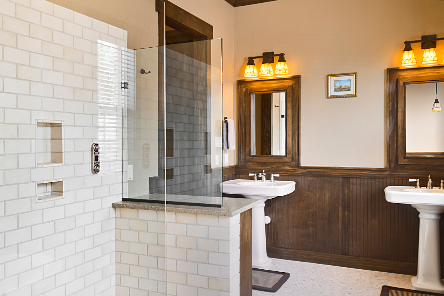 Two pedestal sinks, soaking tub, and frameless shower with body sprays