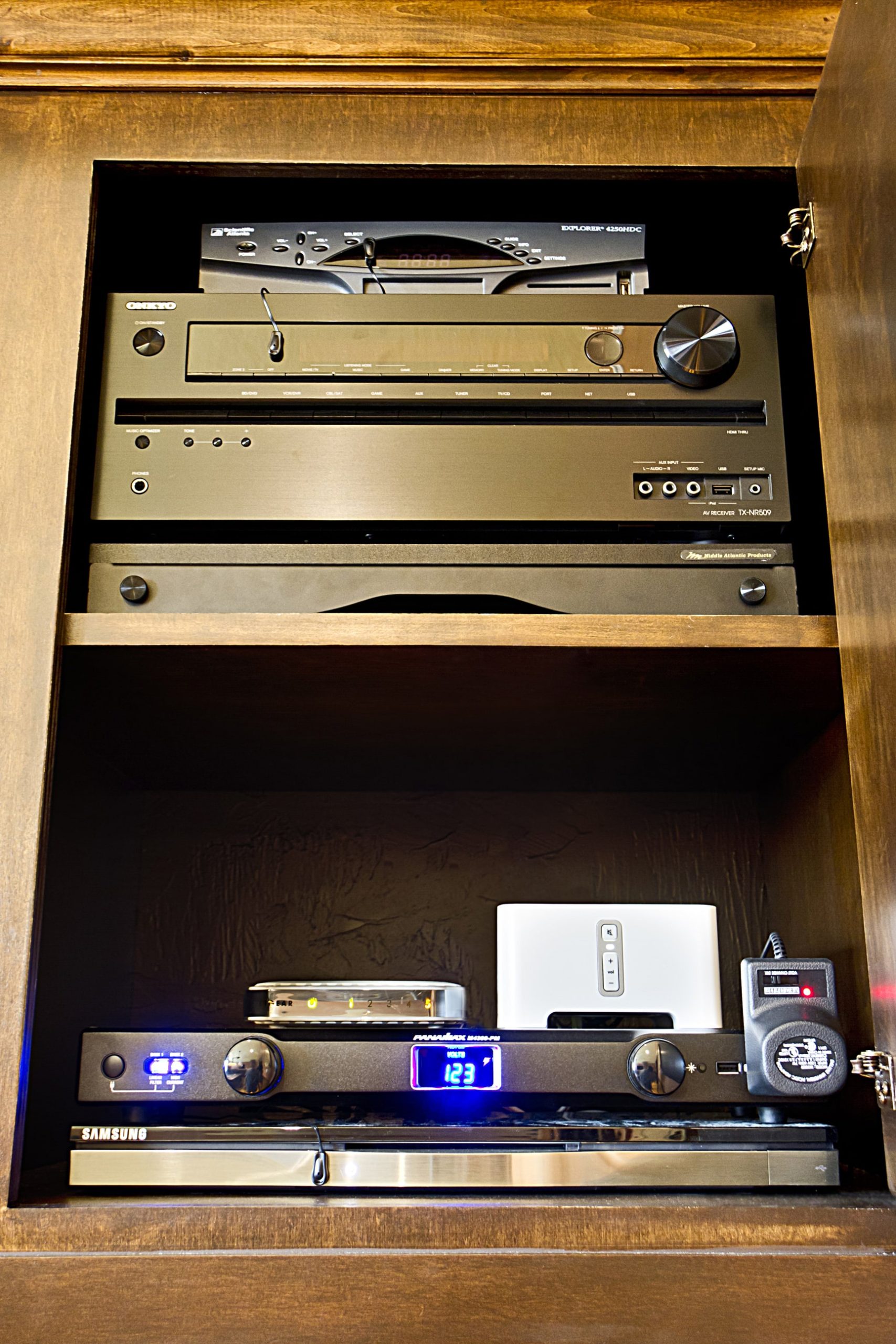 Commercial-style stove, spice racks, utensil holders, and built-in appliances