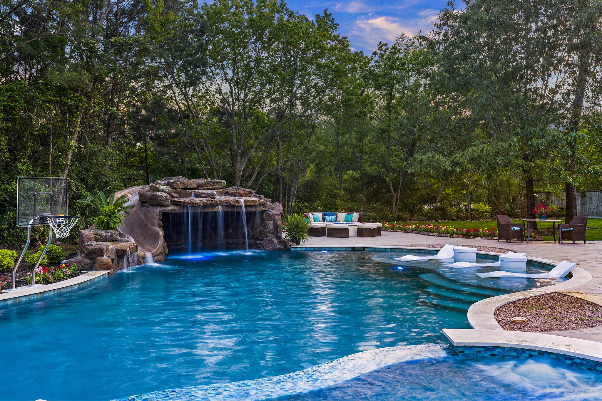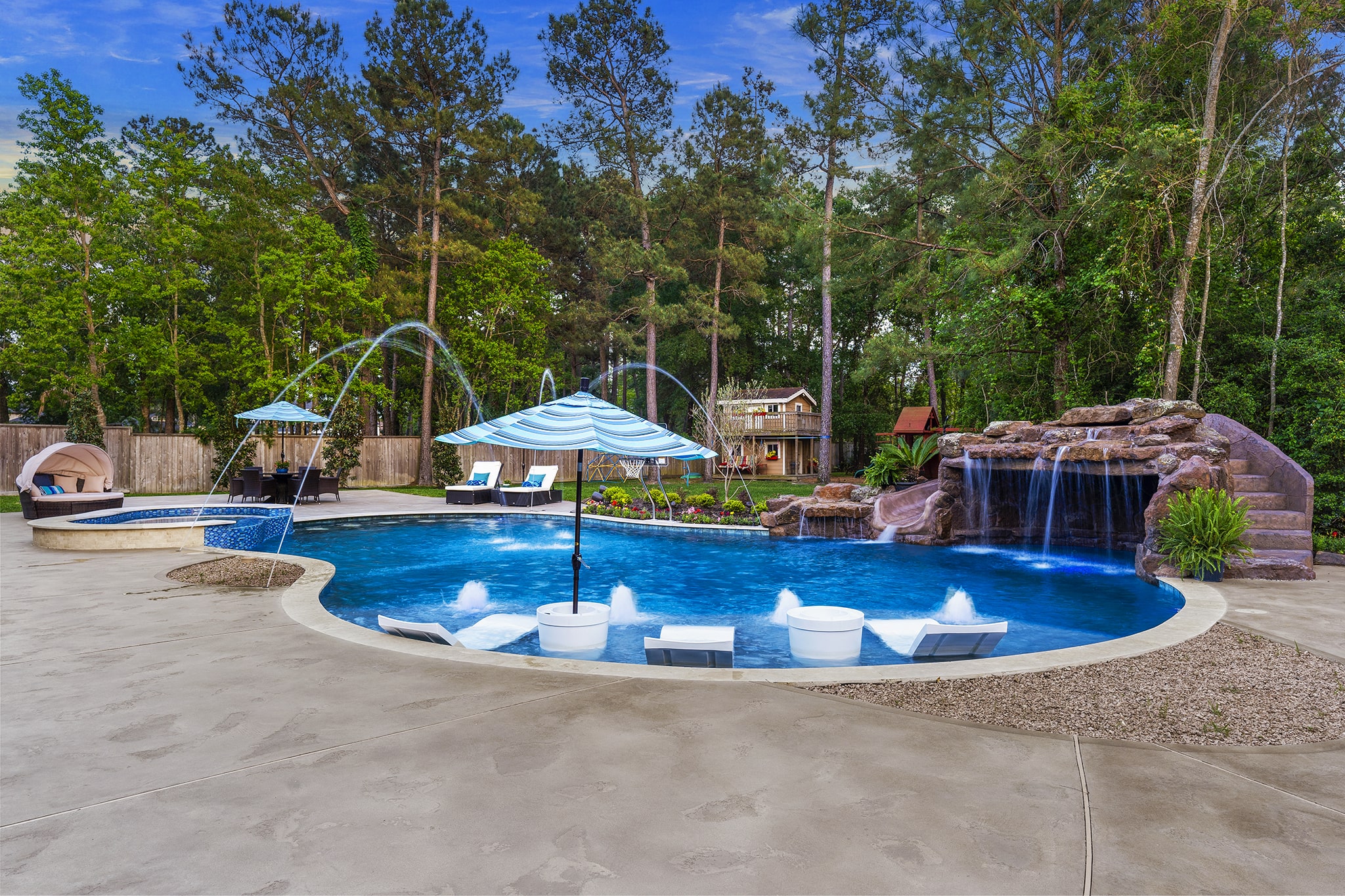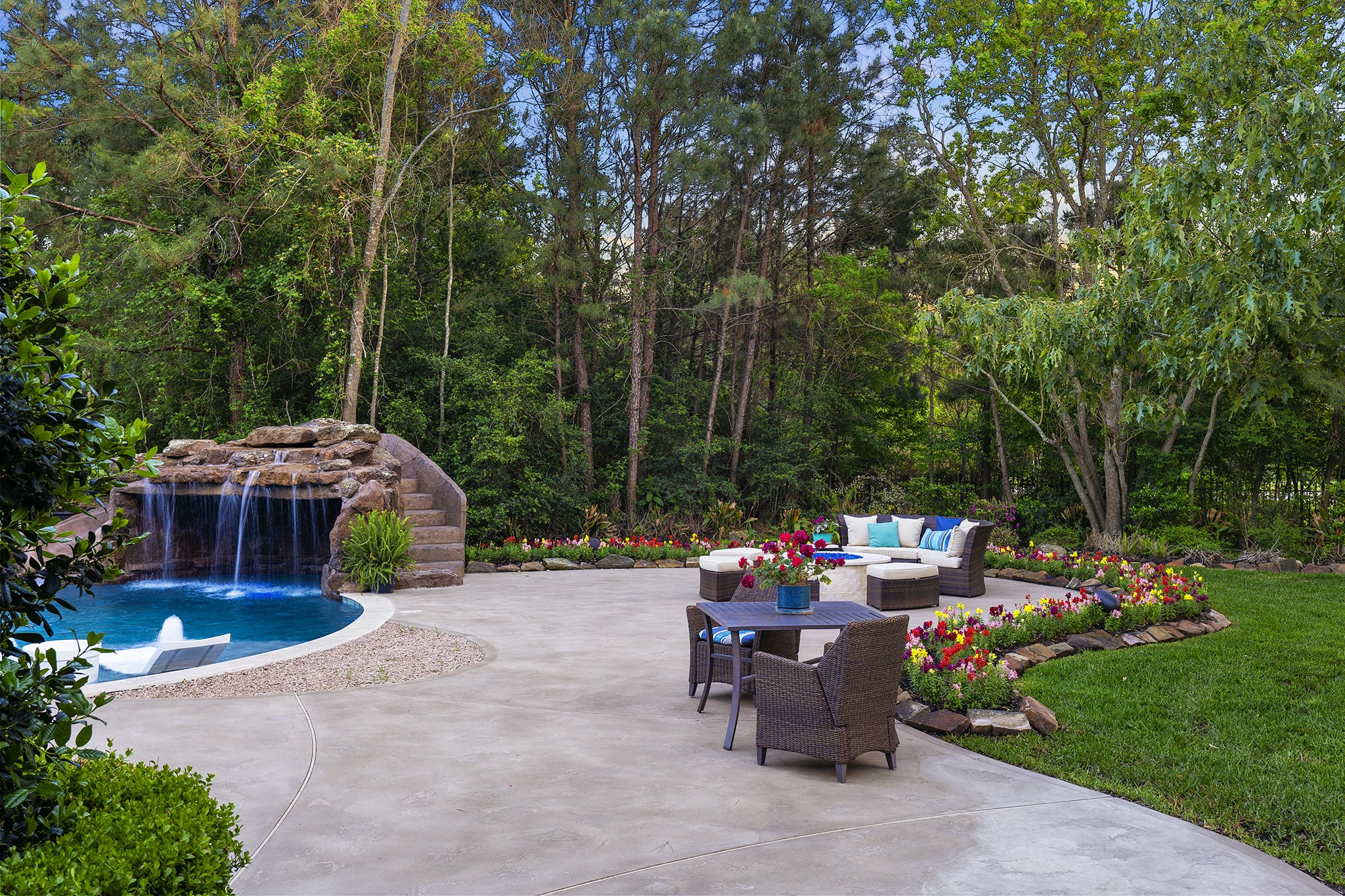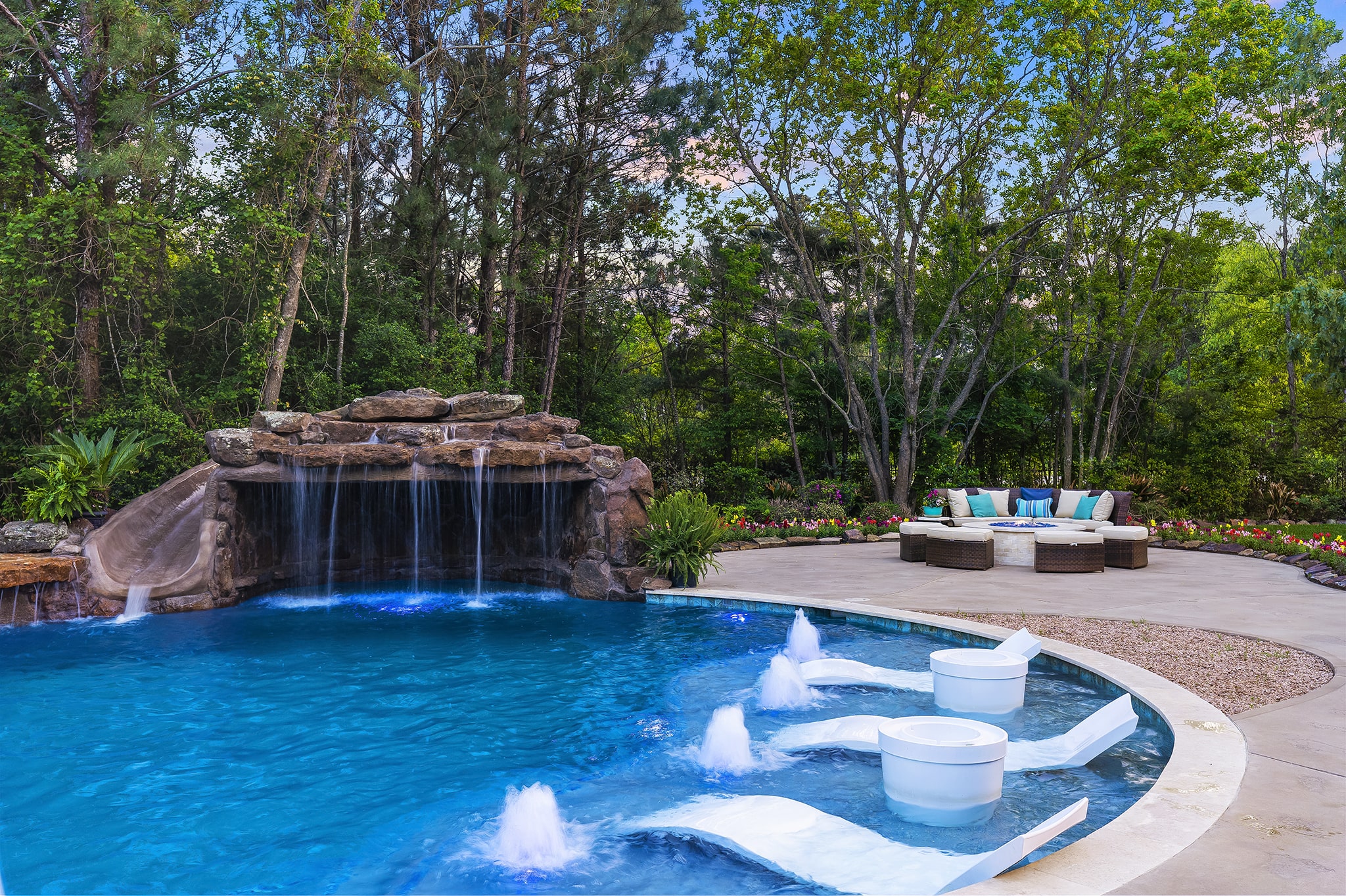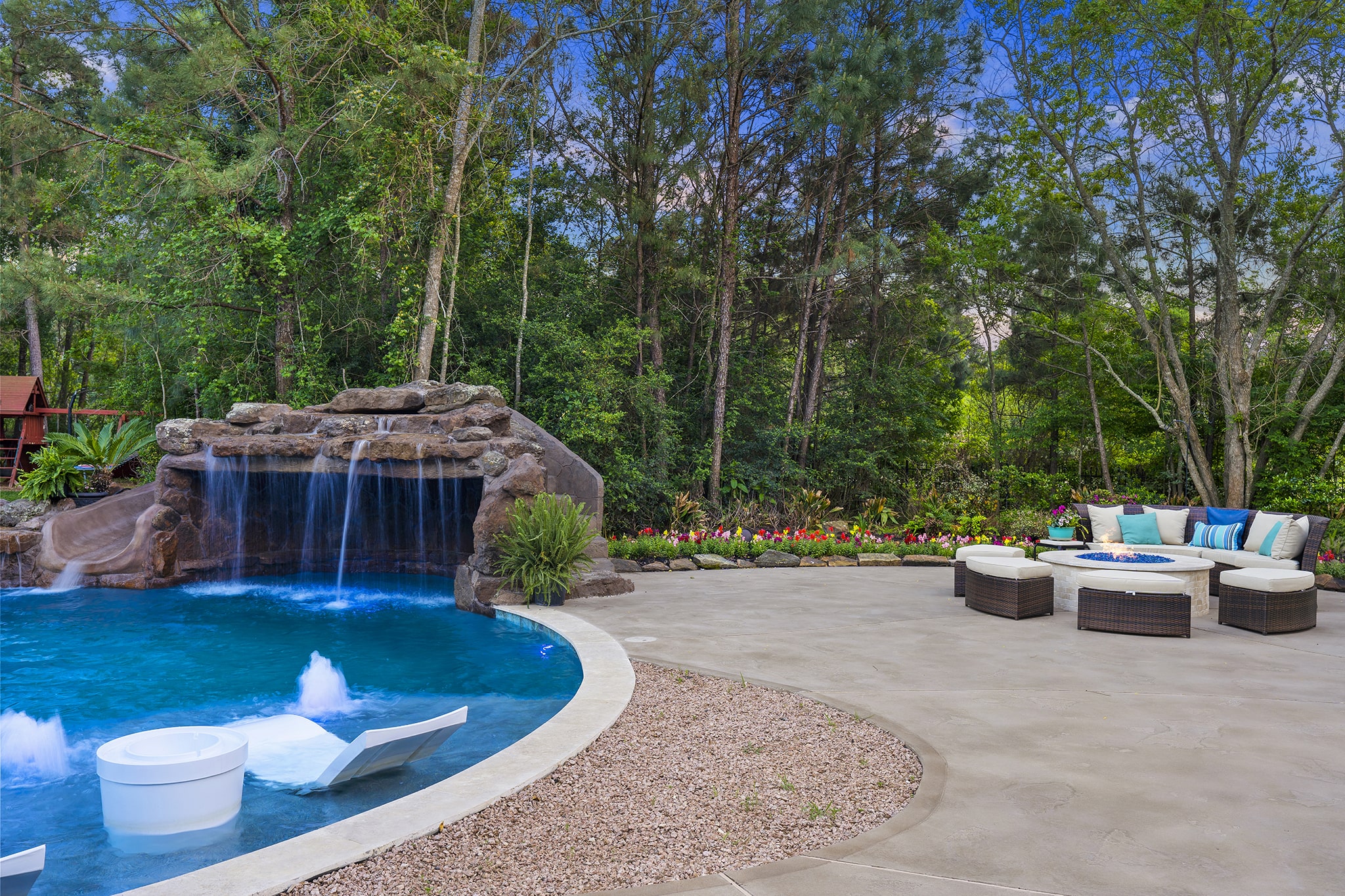 In Benders Landing Estates, Spring, we designed this backyard to feel like a resort. The freeform pool features waterfalls, a natural rock slide, and a grotto for extra fun. Built-in loungers with water bubblers let you relax in the pool, while the raised spa spills gently into the water. A large concrete deck offers space for dining and lounging, and a curved fire pit area with seating adds the perfect place to gather at night.