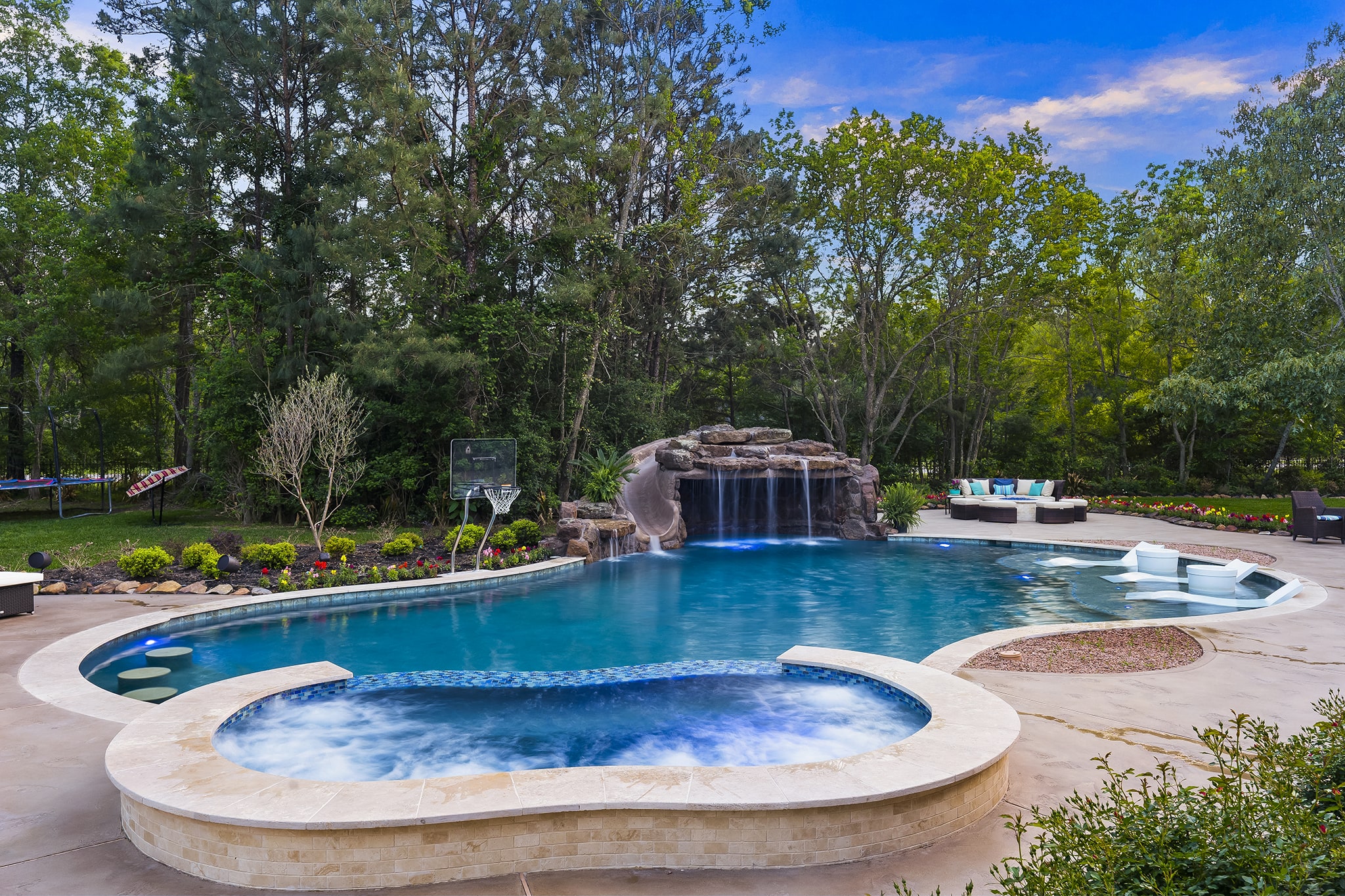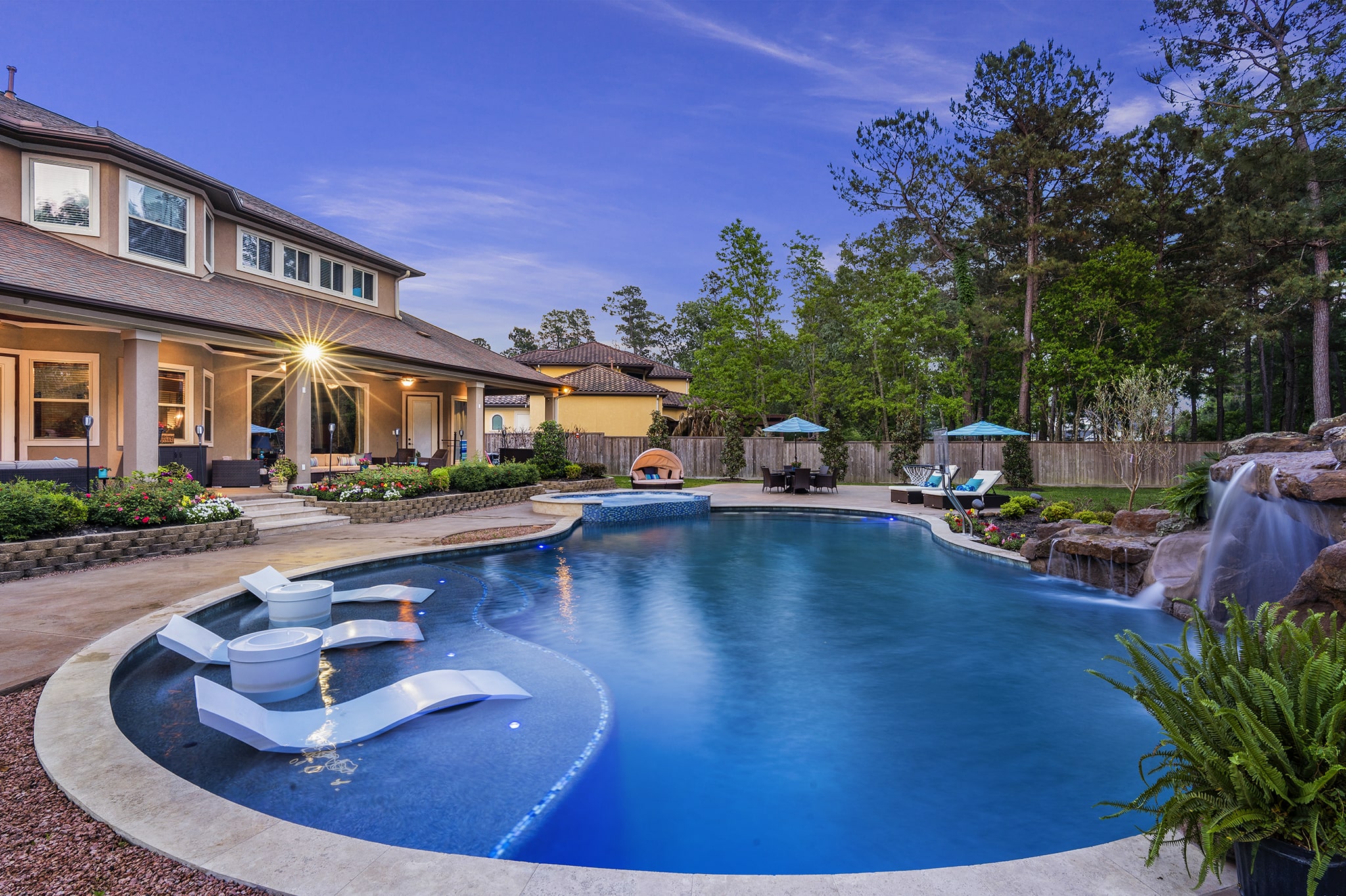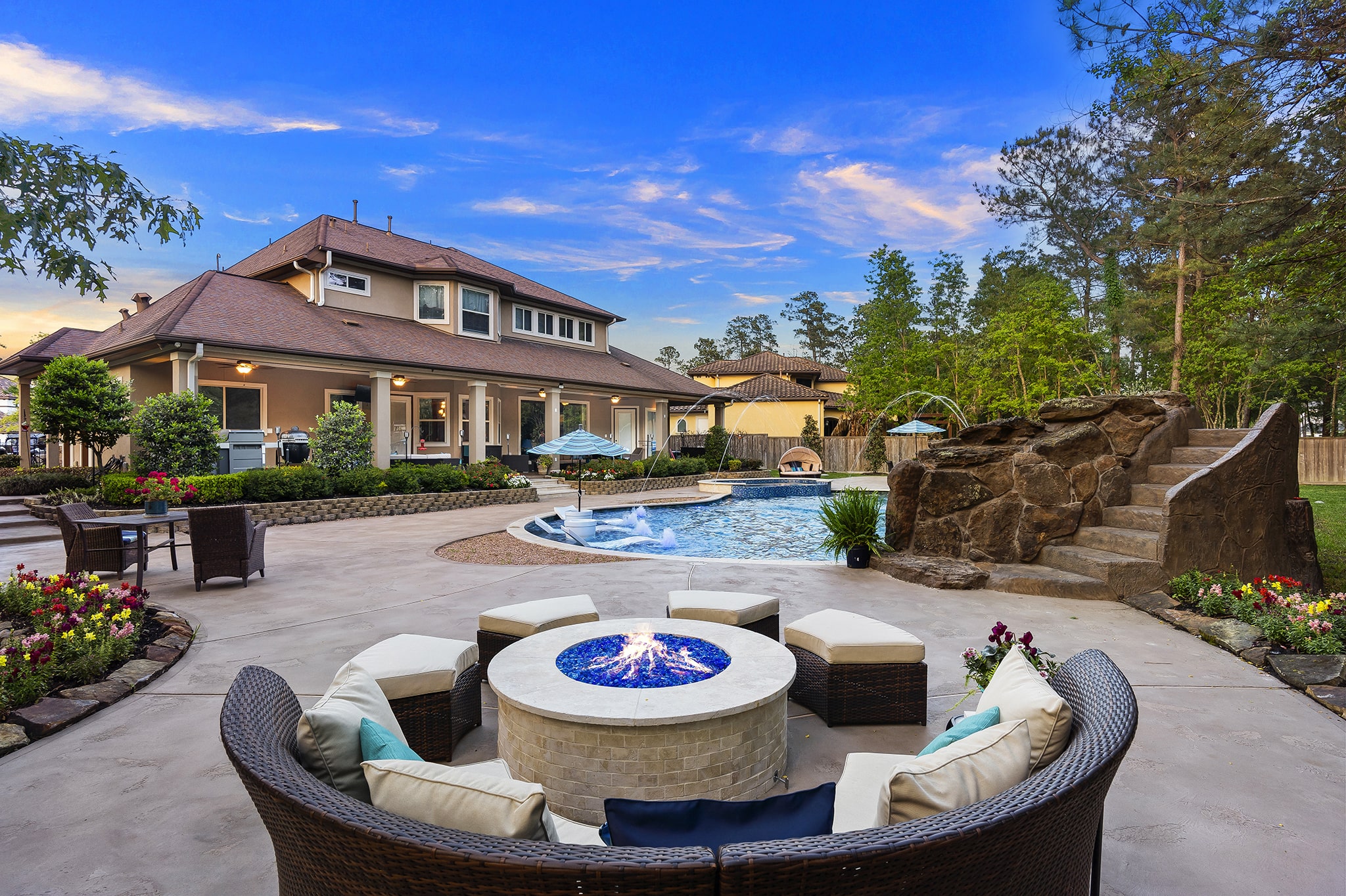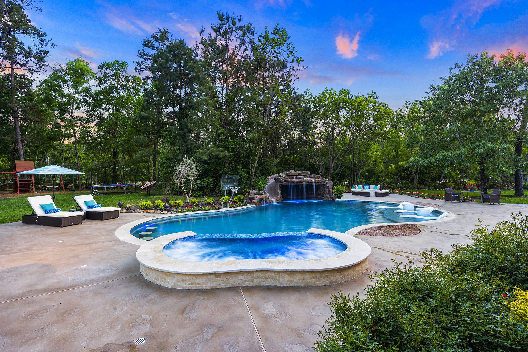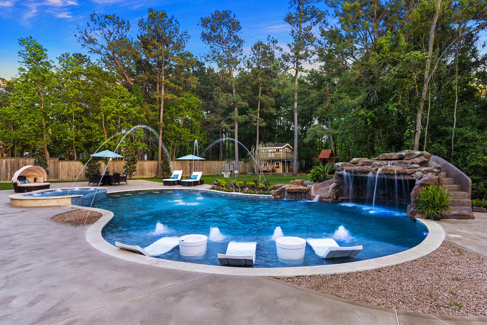 In Benders Landing Estates, Spring, we designed this backyard to feel like a resort. The freeform pool features waterfalls, a natural rock slide, and a grotto for extra fun. Built-in loungers with water bubblers let you relax in the pool, while the raised spa spills gently into the water. A large concrete deck offers space for dining and lounging, and a curved fire pit area with seating adds the perfect place to gather at night.