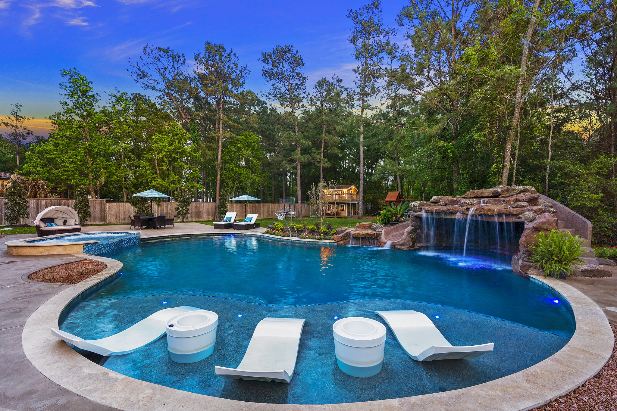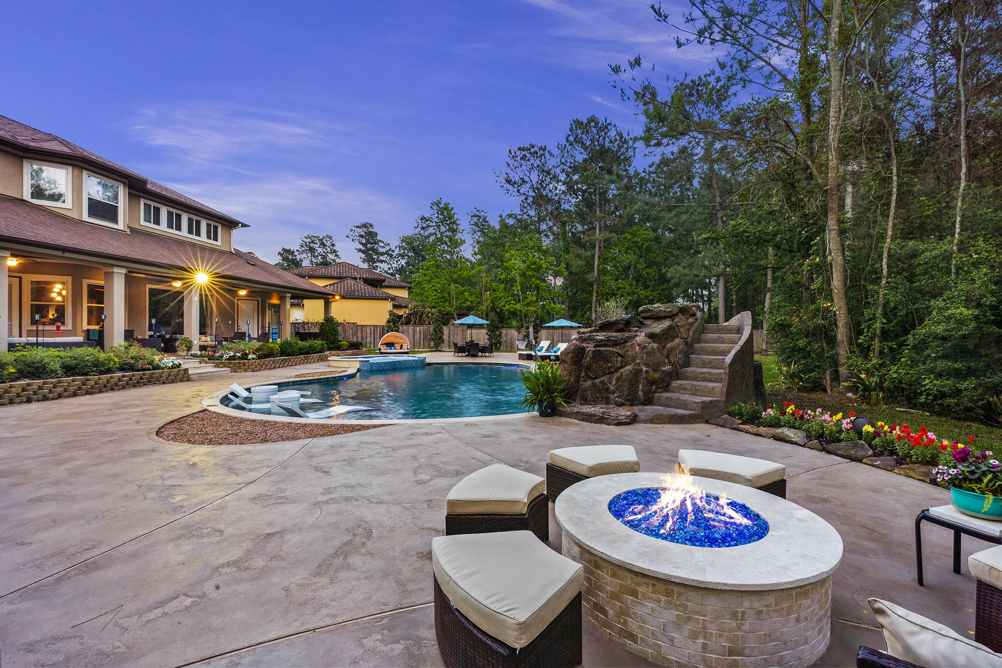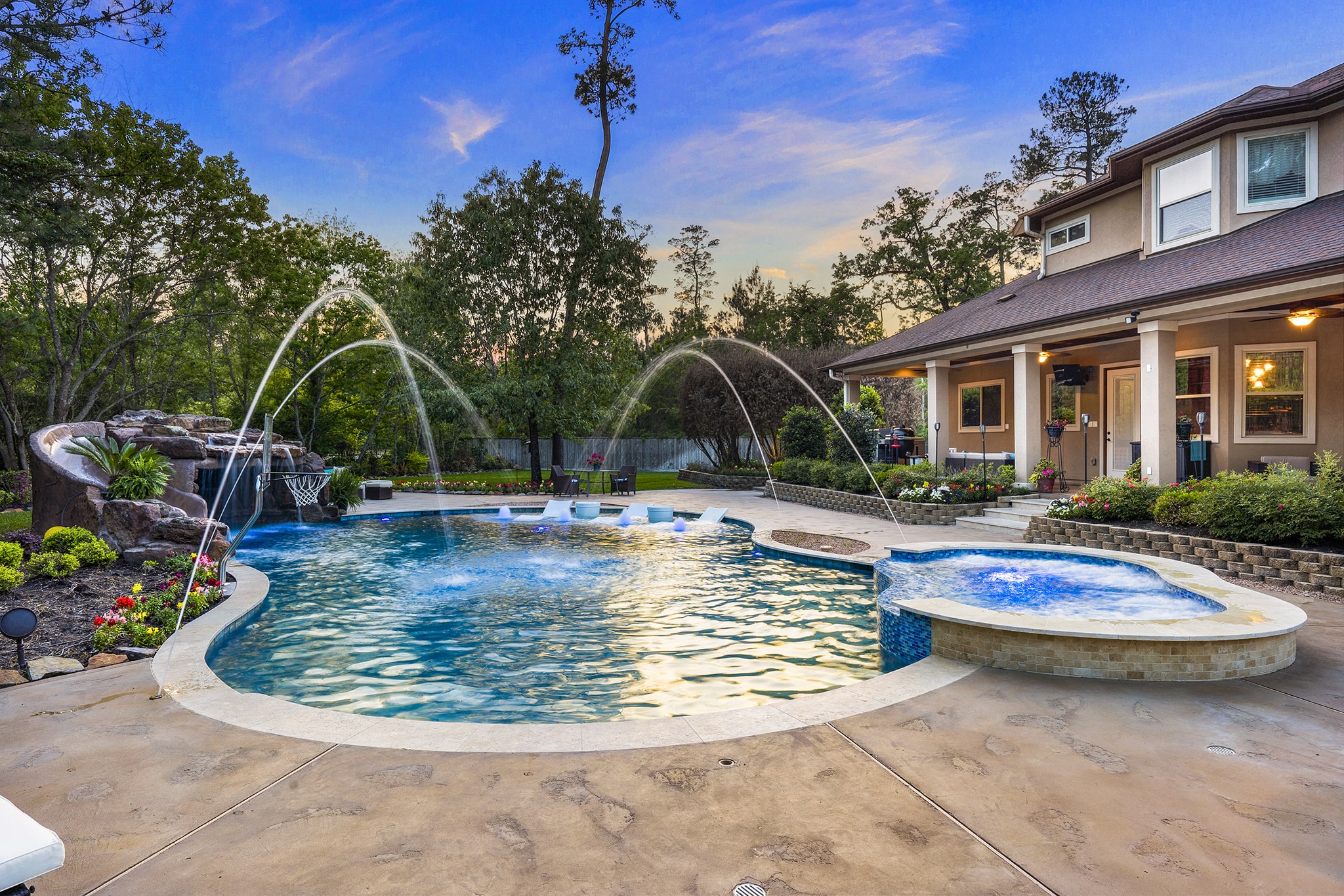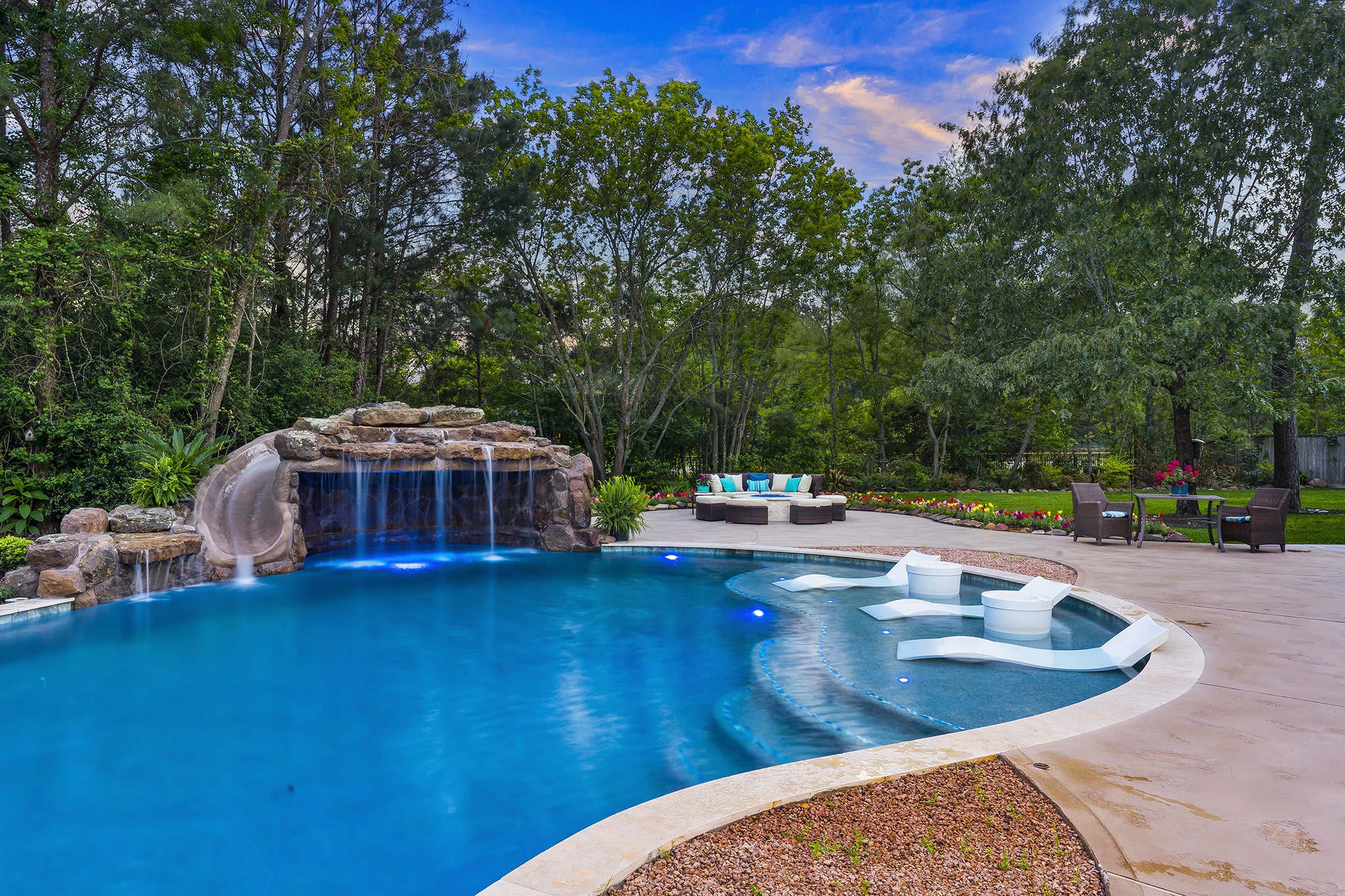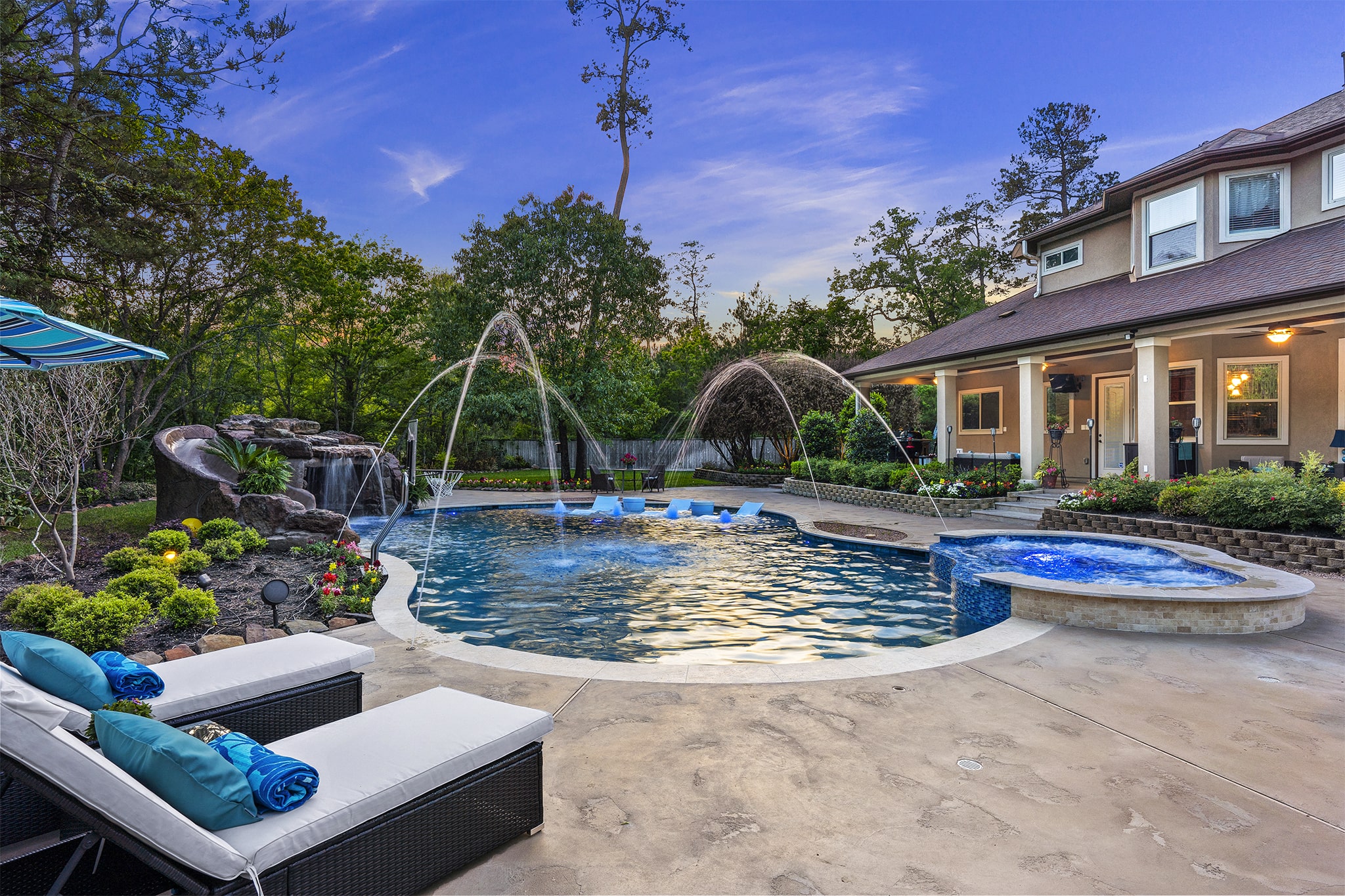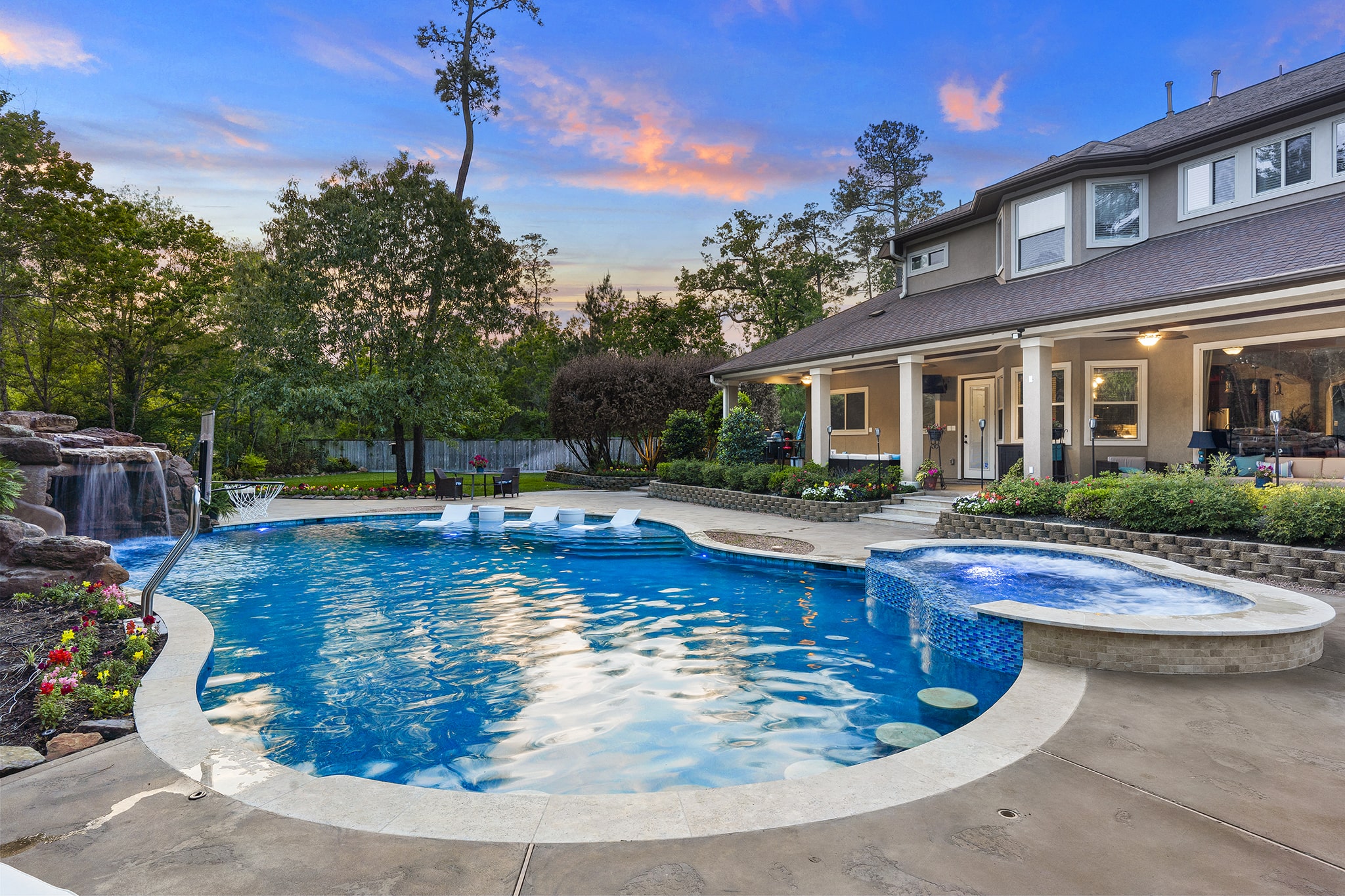 In Benders Landing Estates, Spring, we designed this backyard to feel like a resort. The freeform pool features waterfalls, a natural rock slide, and a grotto for extra fun. Built-in loungers with water bubblers let you relax in the pool, while the raised spa spills gently into the water. A large concrete deck offers space for dining and lounging, and a curved fire pit area with seating adds the perfect place to gather at night.