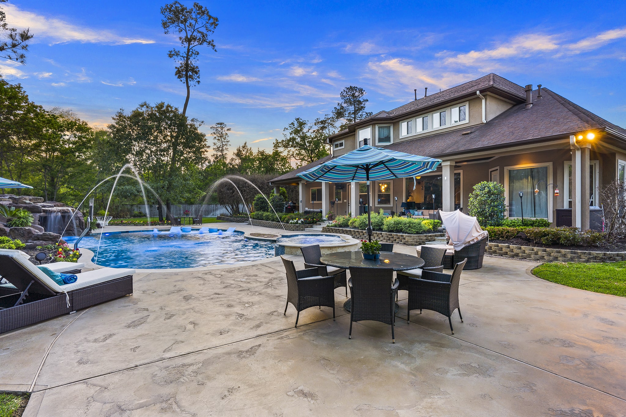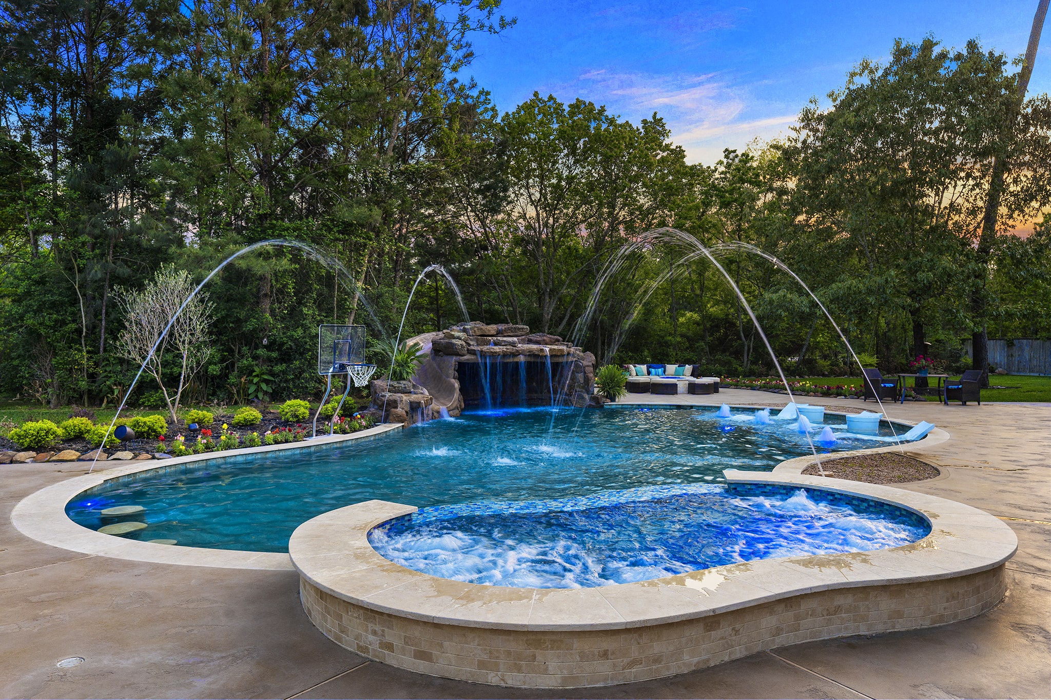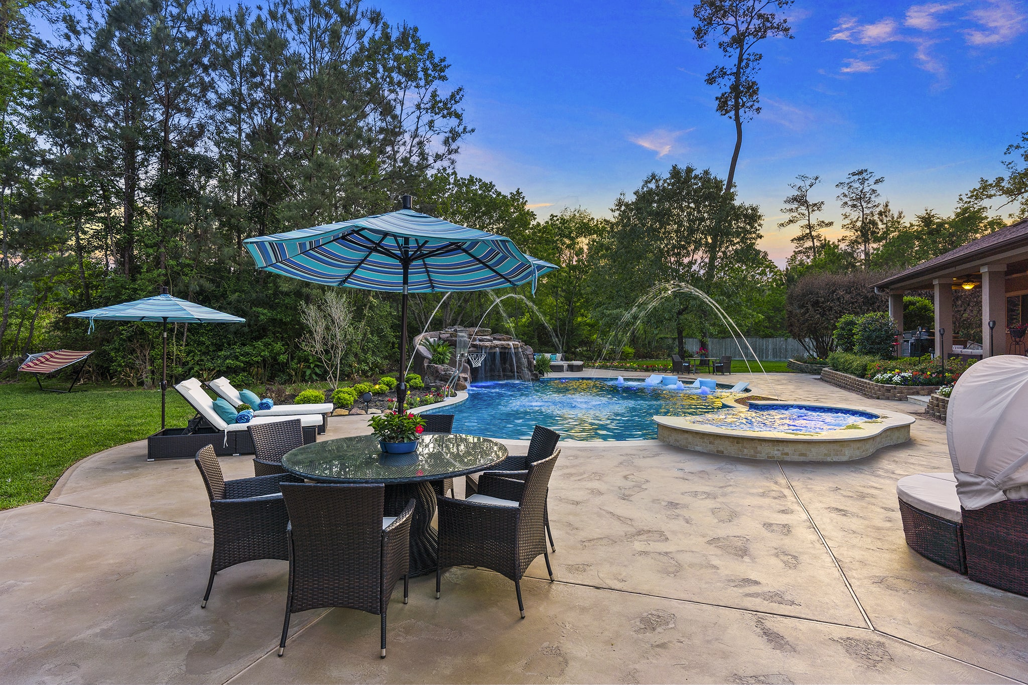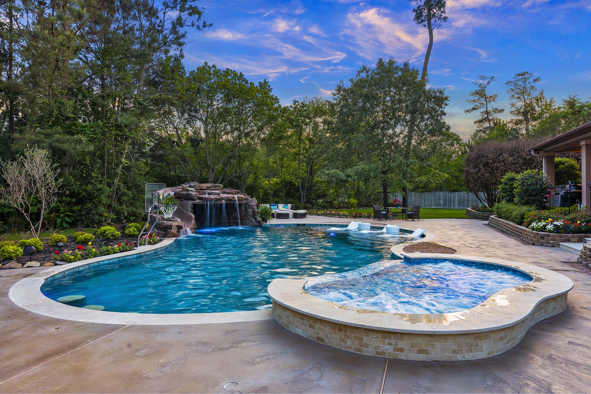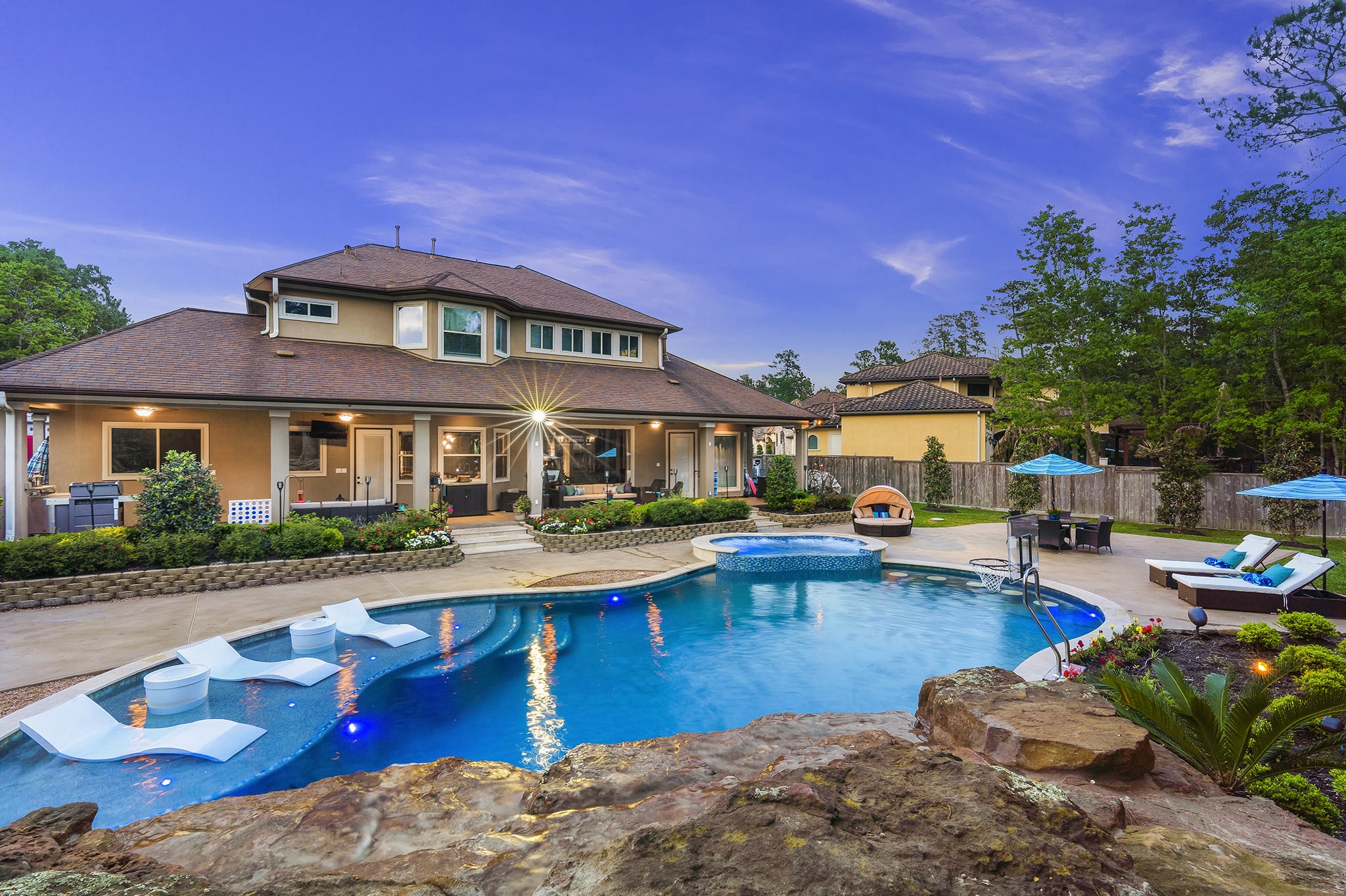 In Benders Landing Estates, Spring, we designed this backyard to feel like a resort. The freeform pool features waterfalls, a natural rock slide, and a grotto for extra fun. Built-in loungers with water bubblers let you relax in the pool, while the raised spa spills gently into the water. A large concrete deck offers space for dining and lounging, and a curved fire pit area with seating adds the perfect place to gather at night.