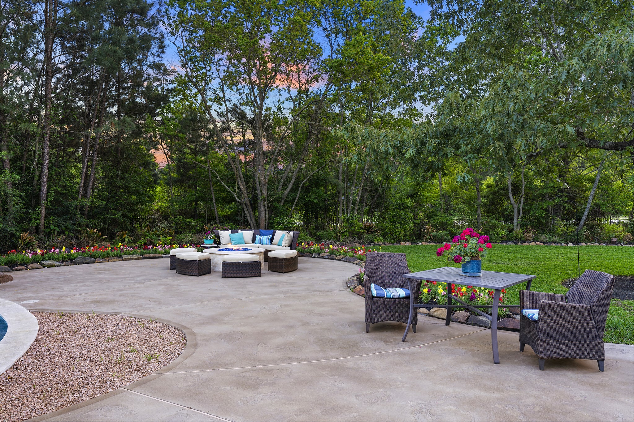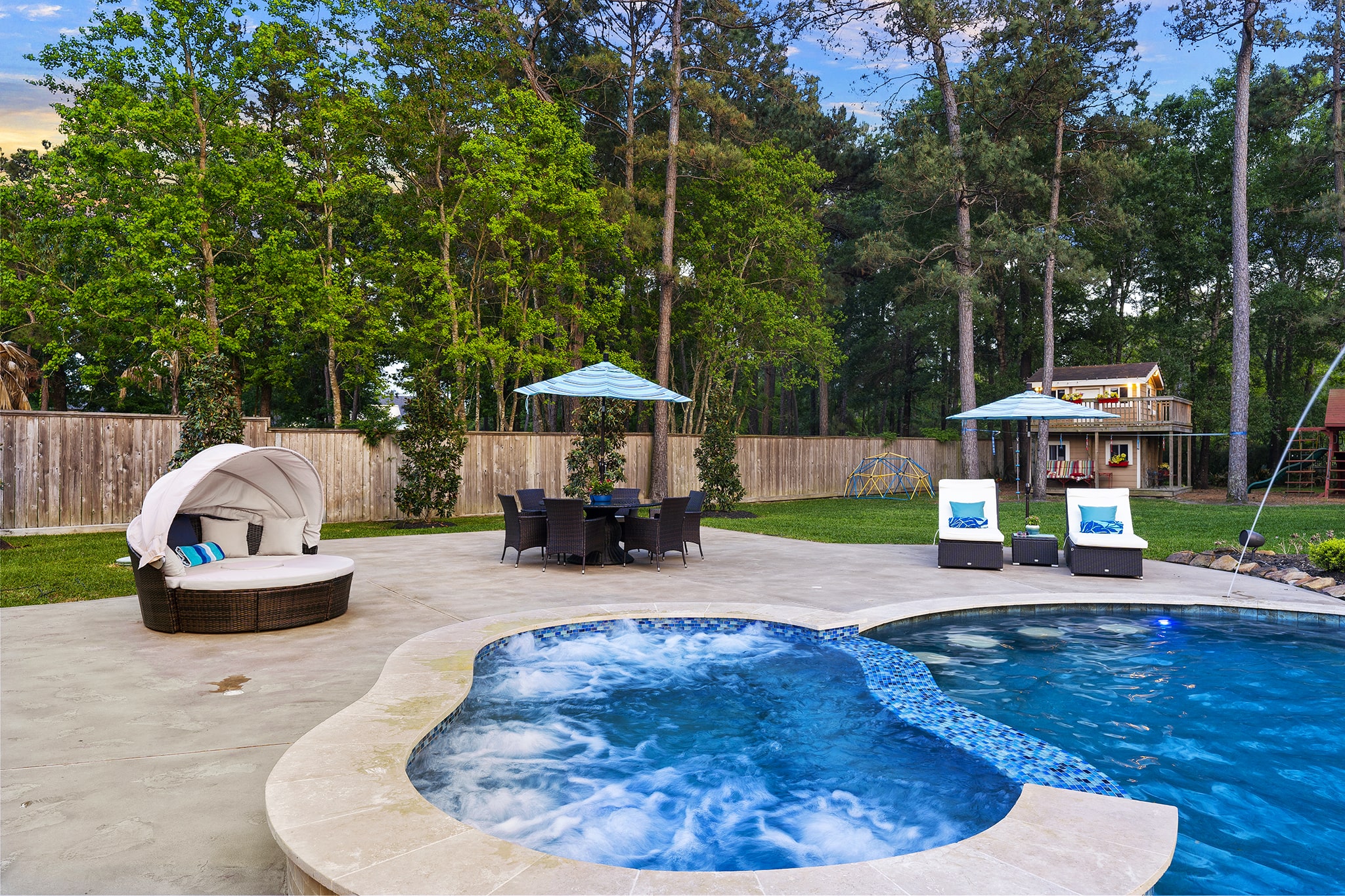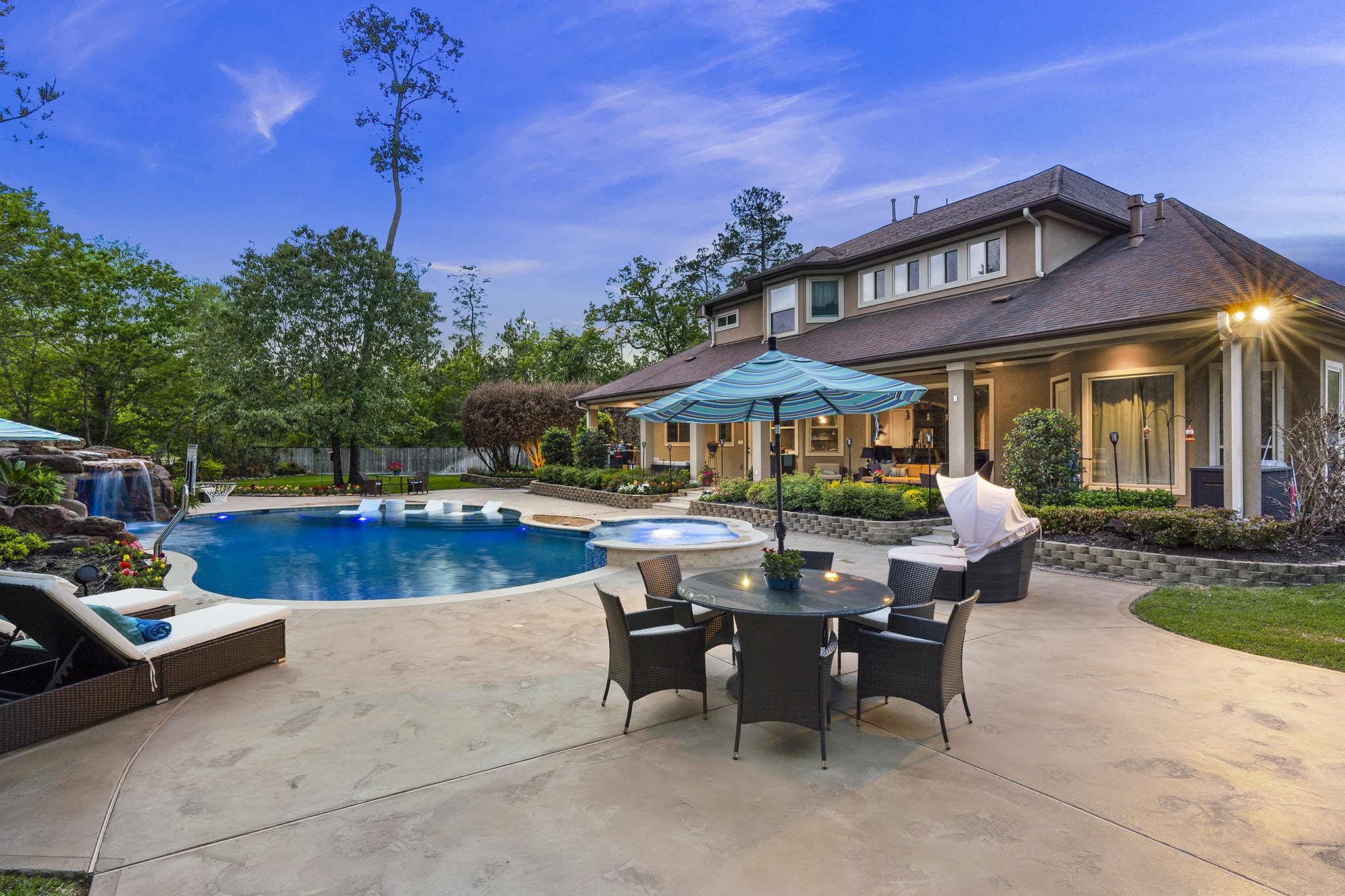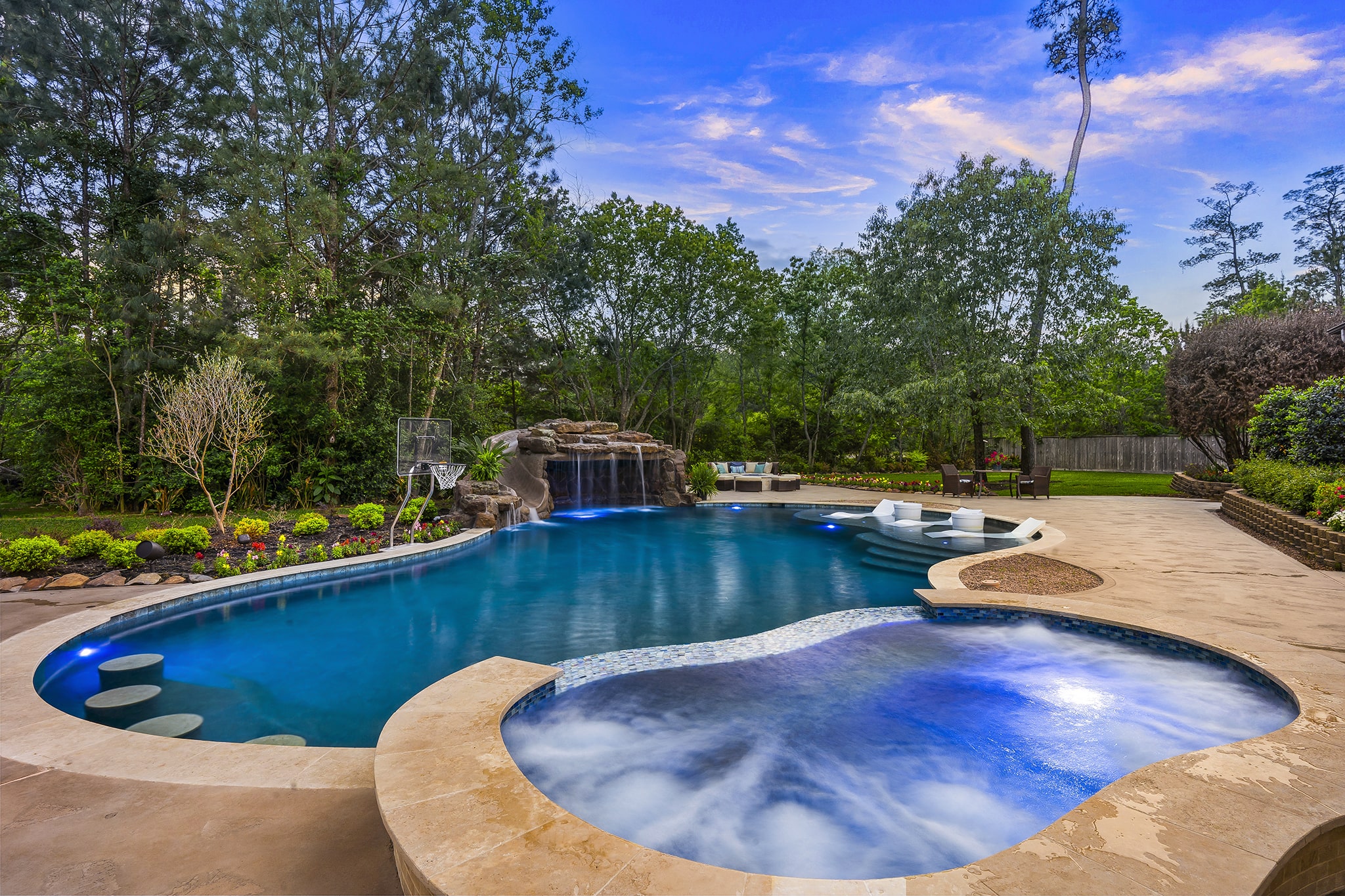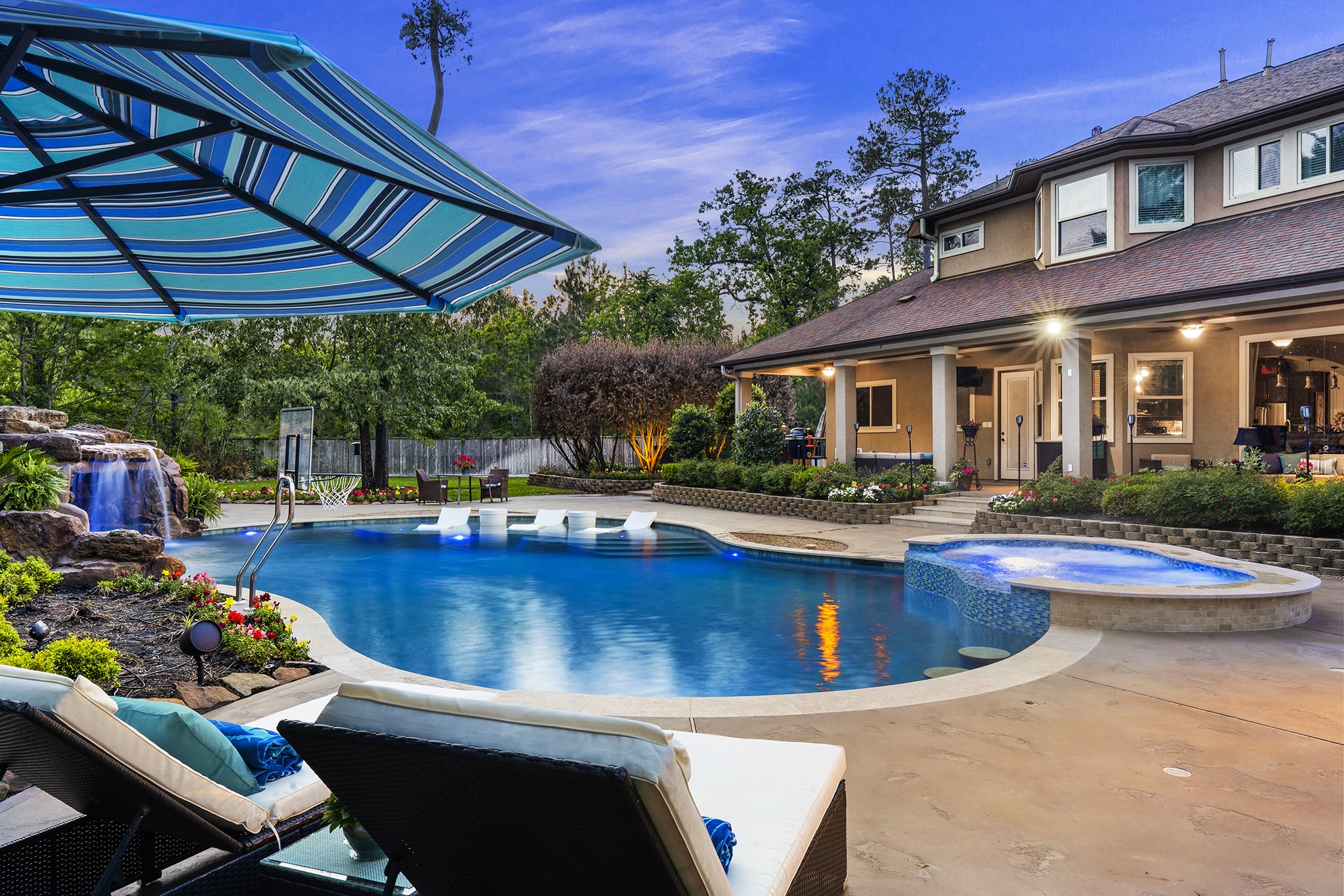 In Benders Landing Estates, Spring, we designed this backyard to feel like a resort. The freeform pool features waterfalls, a natural rock slide, and a grotto for extra fun. Built-in loungers with water bubblers let you relax in the pool, while the raised spa spills gently into the water. A large concrete deck offers space for dining and lounging, and a curved fire pit area with seating adds the perfect place to gather at night.