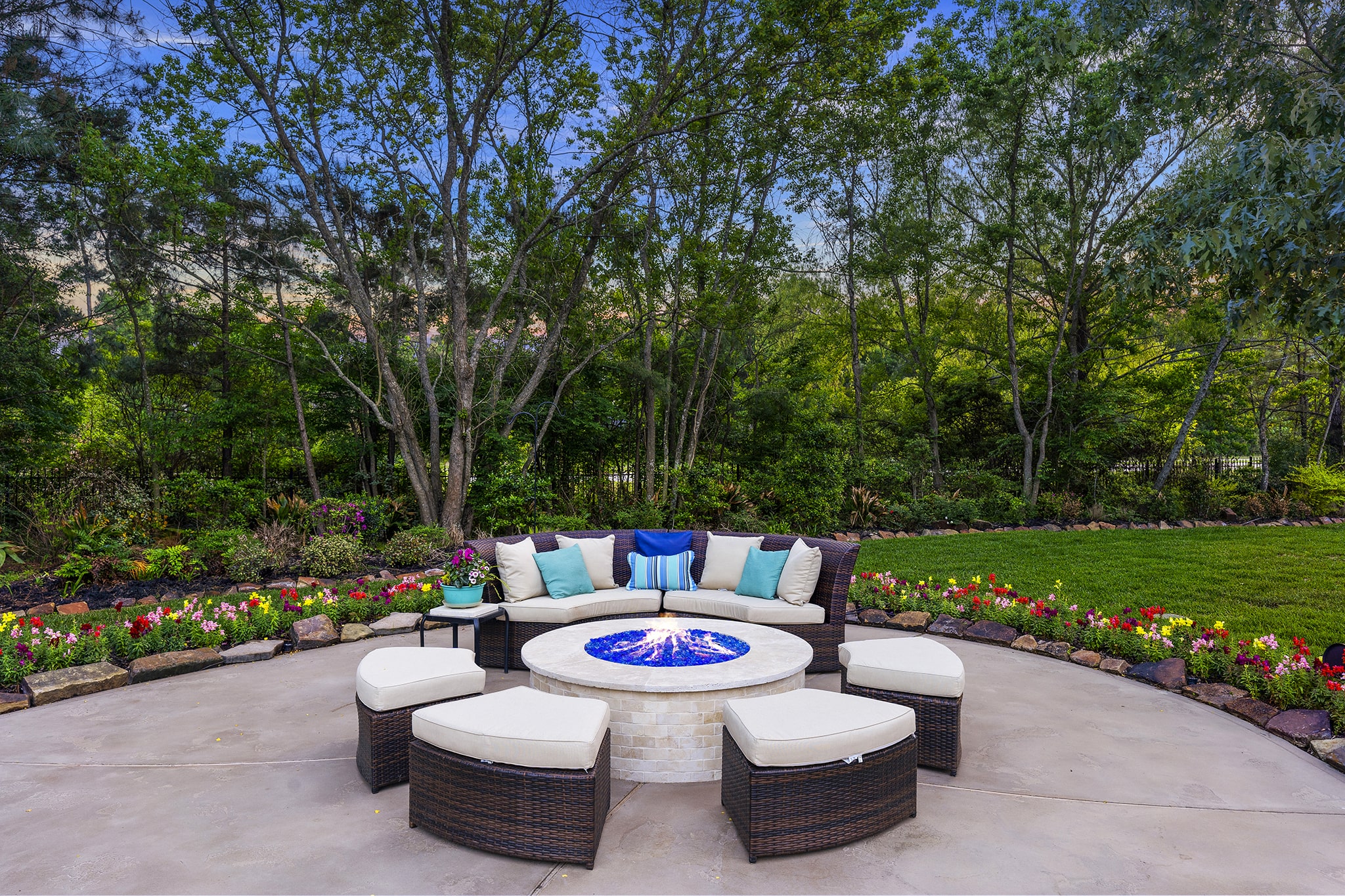 Raised fire pit area with curved seating and accent lighting