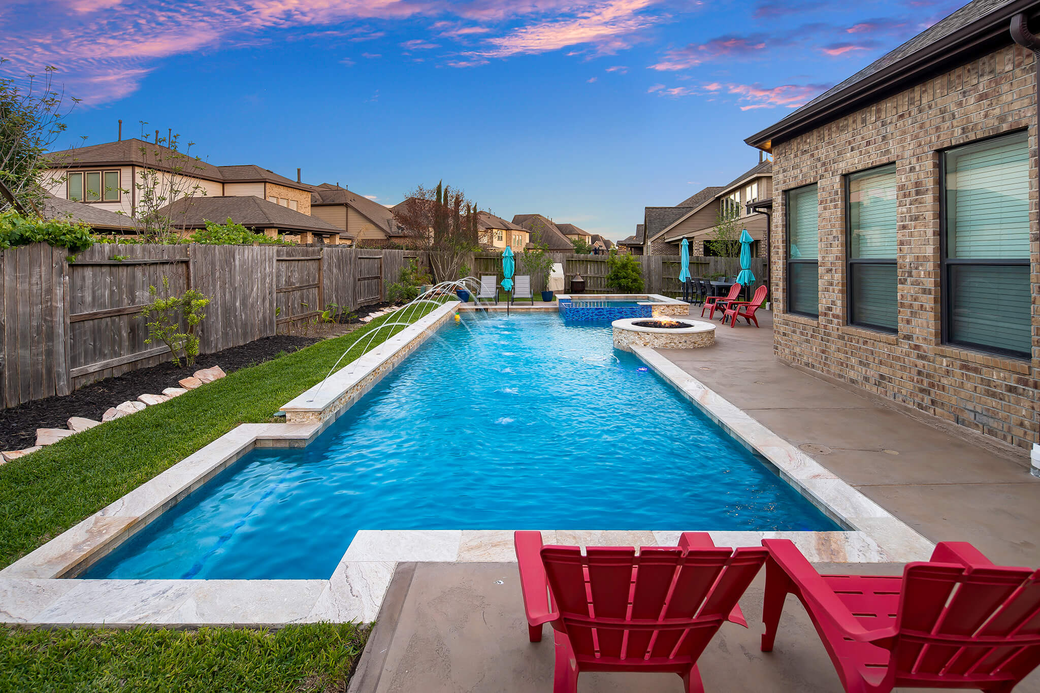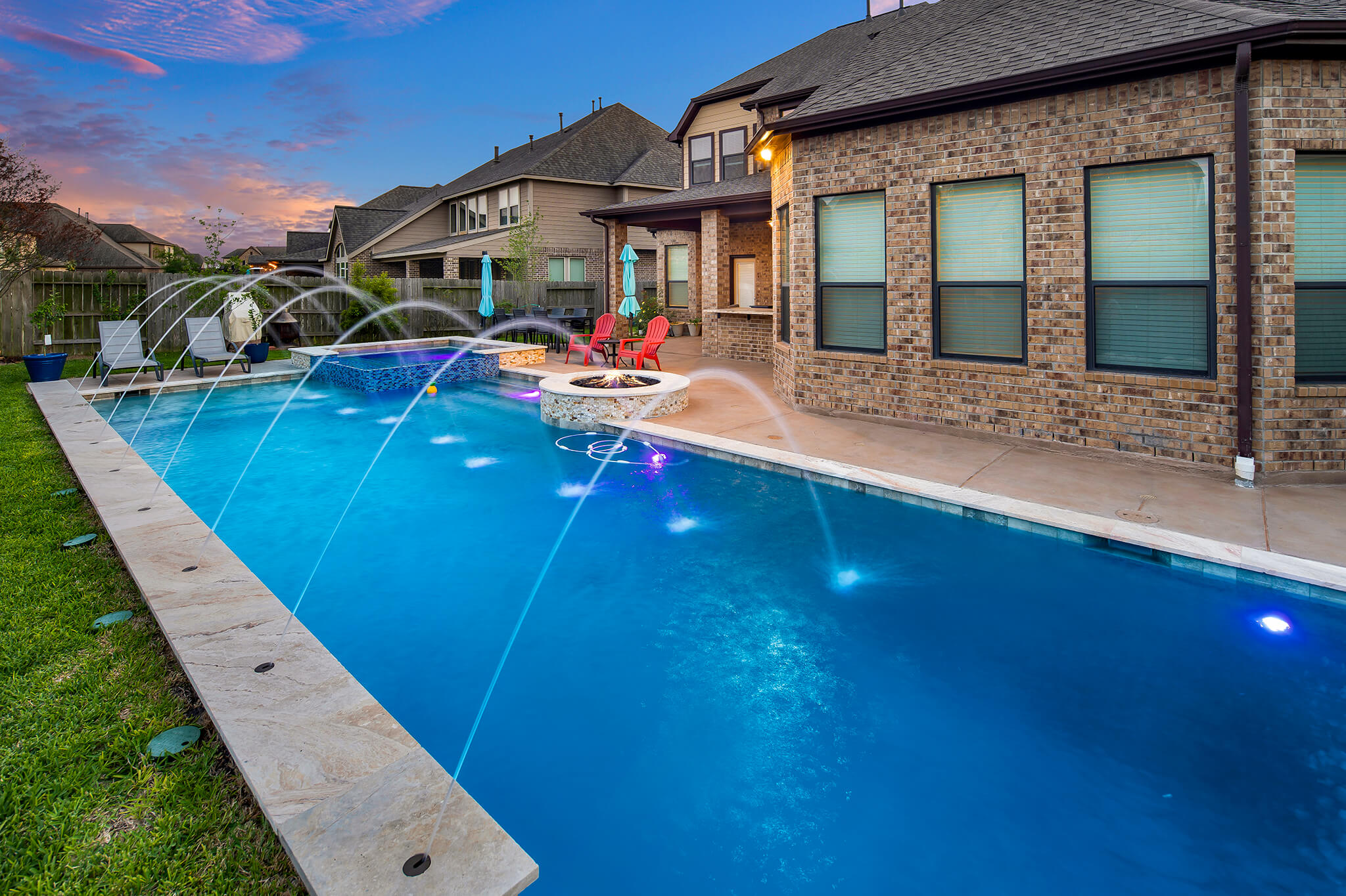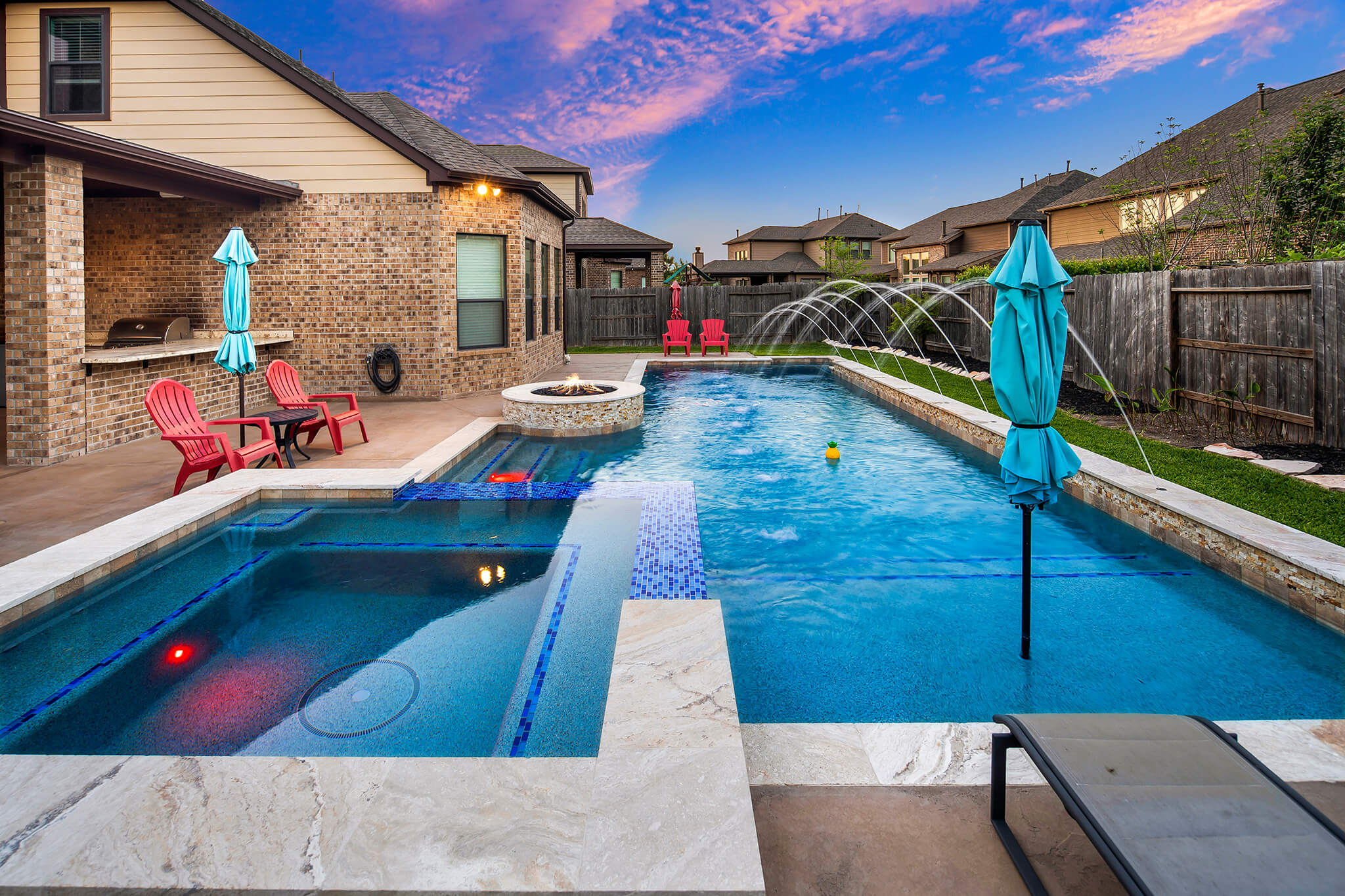 Geometric Pool with Deck Jets and Outdoor Kitchen in Cypress, Texas