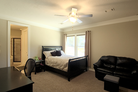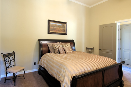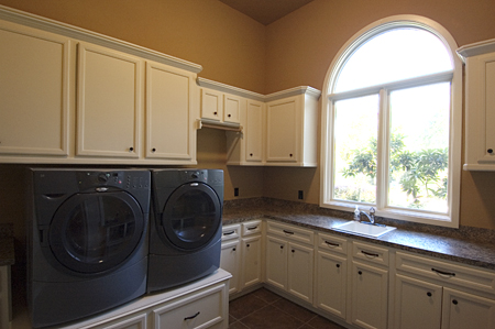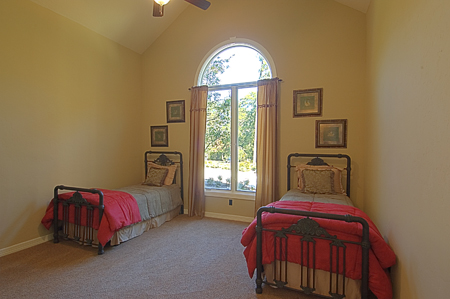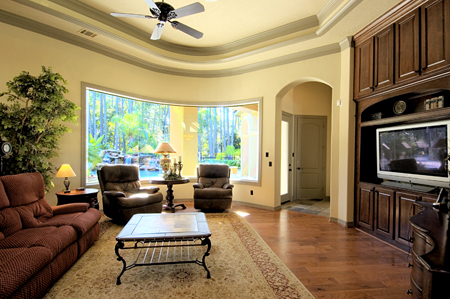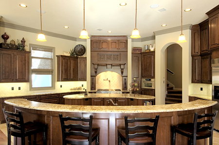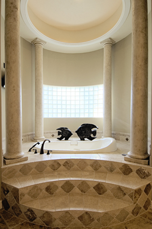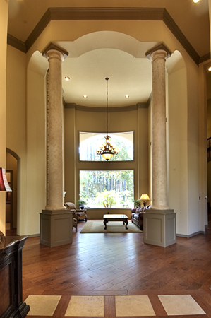 This Mediterranean-style home in Holly Creek, Tomball, has a tile roof and arched front entry for a classic look. Inside, the grand entrance features double columns and a barrel ceiling. The kitchen is round and cozy, with granite countertops and custom cabinets. In the primary bath, we added a spa-style tub nook with decorative columns and a curved glass block window that lets in soft natural light.