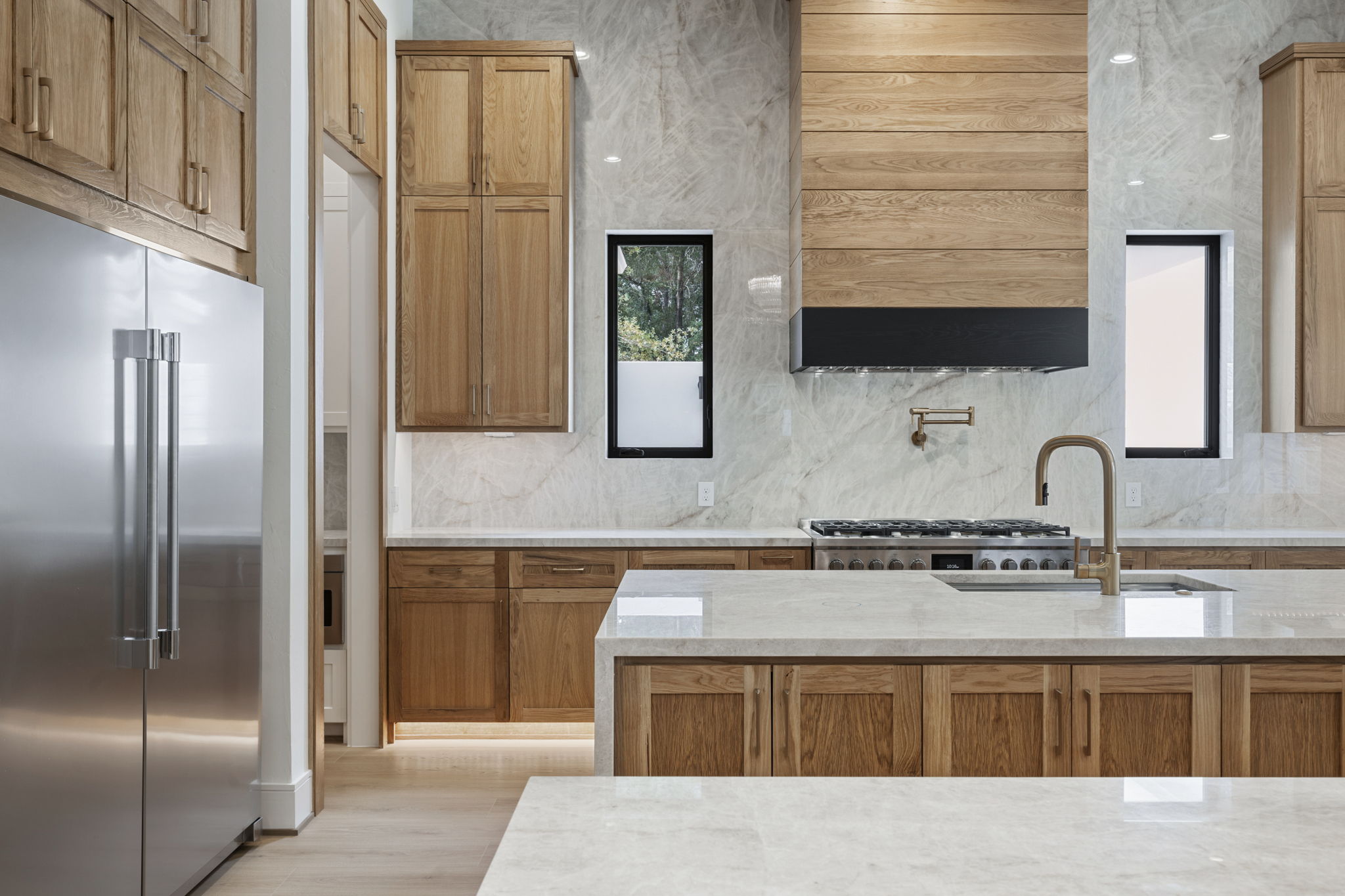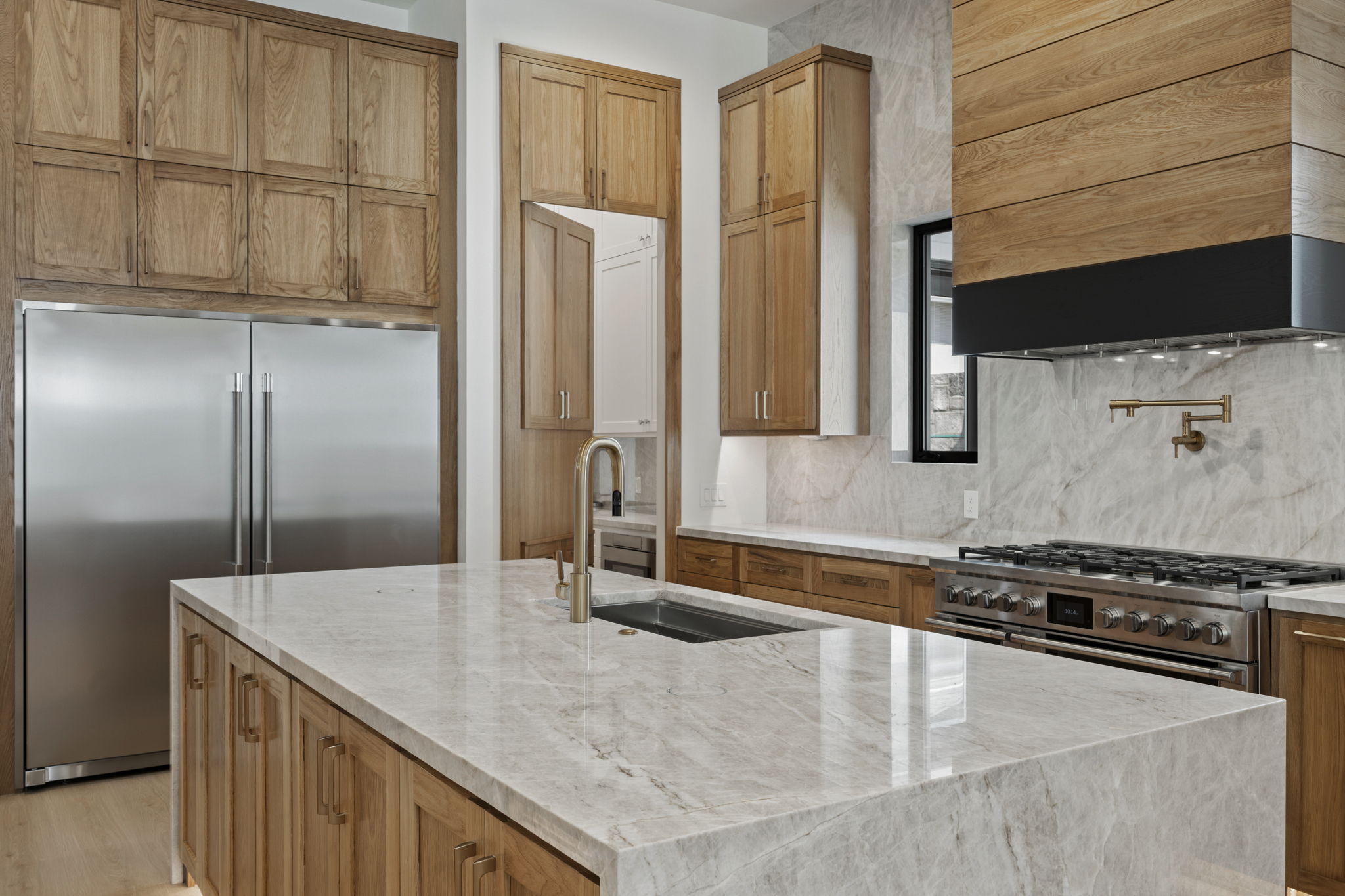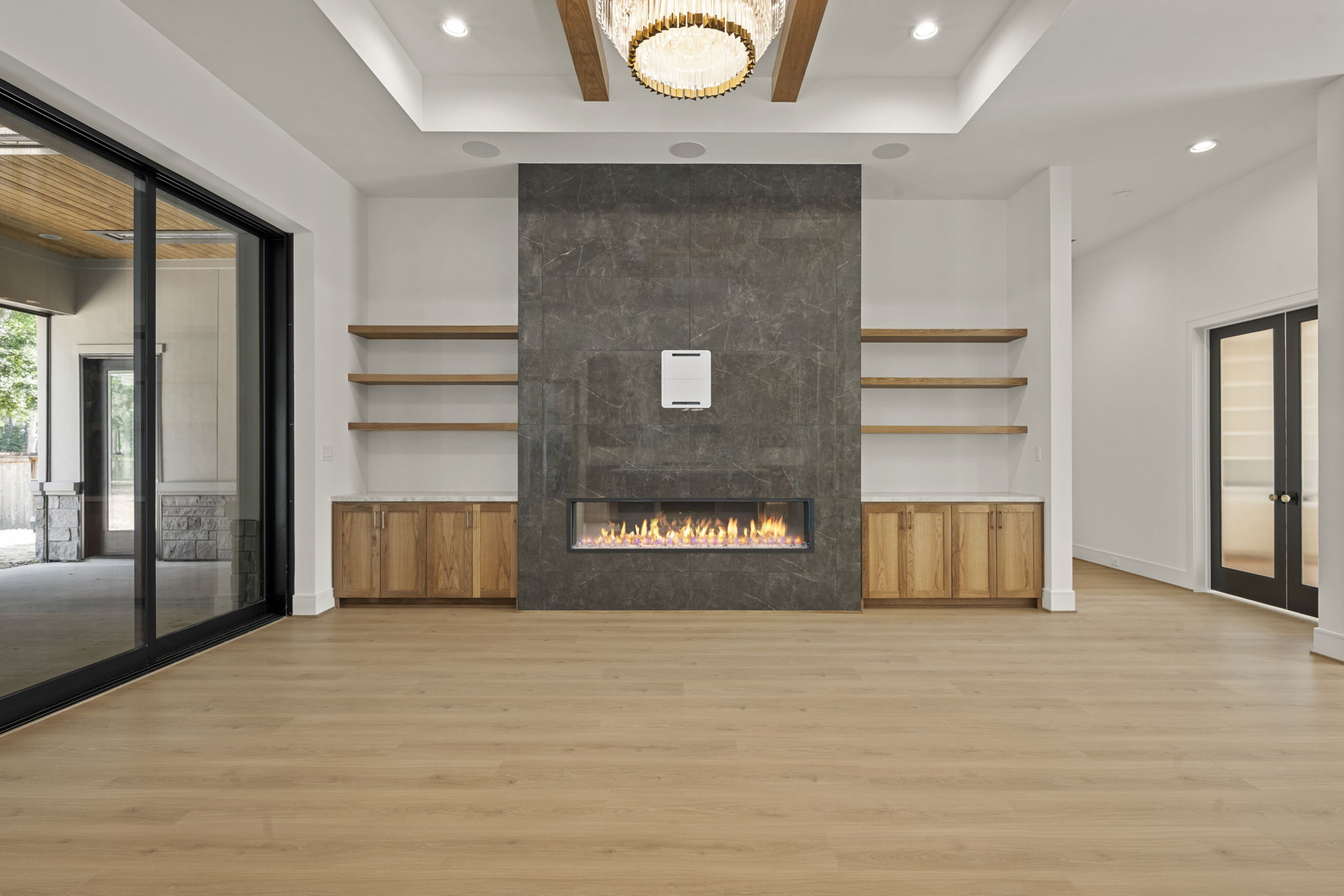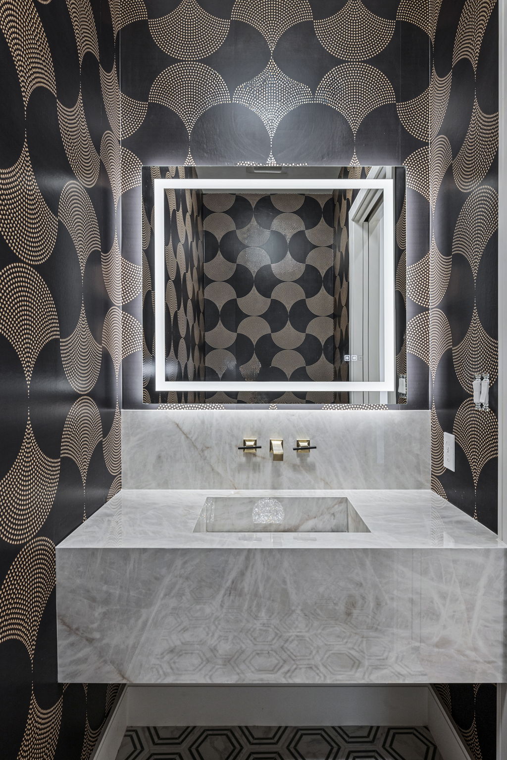 This modern custom home blends natural warmth with sleek contemporary design. The open living area showcases a striking floor-to-ceiling stone fireplace, floating shelves, and expansive glass sliders that connect seamlessly to the outdoor space. The kitchen features dual waterfall islands, rich wood cabinetry, and professional-grade appliances highlighted by bold lighting and marble surfaces. A dramatic powder bath with geometric wallpaper and a luxurious spa-like primary bath with dual showers, freestanding tub, and marble finishes complete the home’s refined aesthetic.