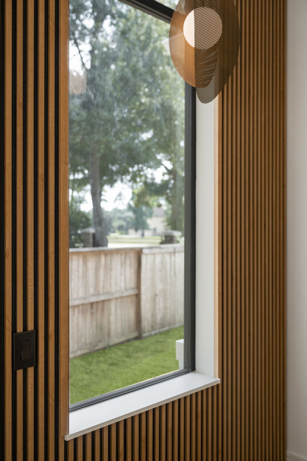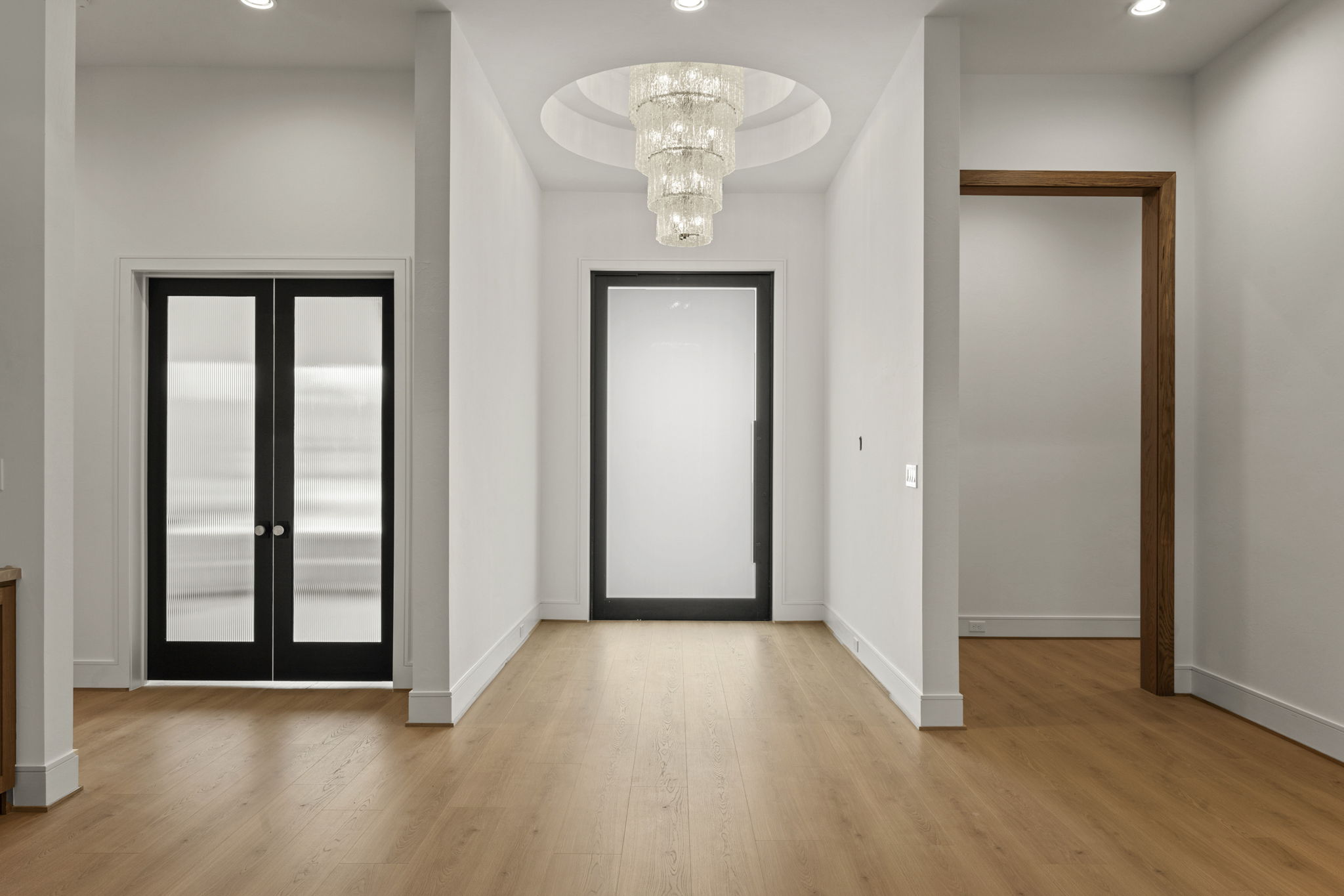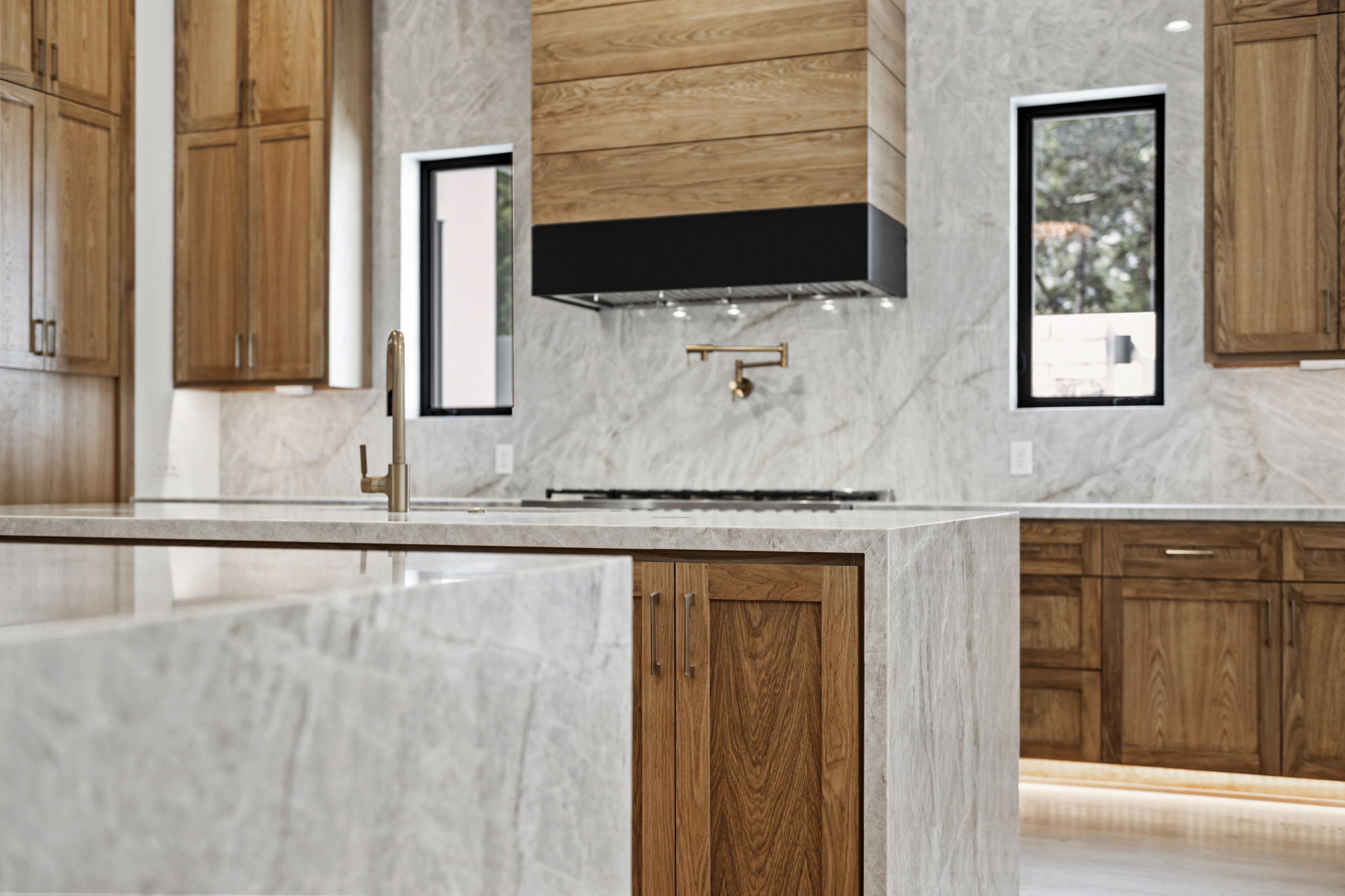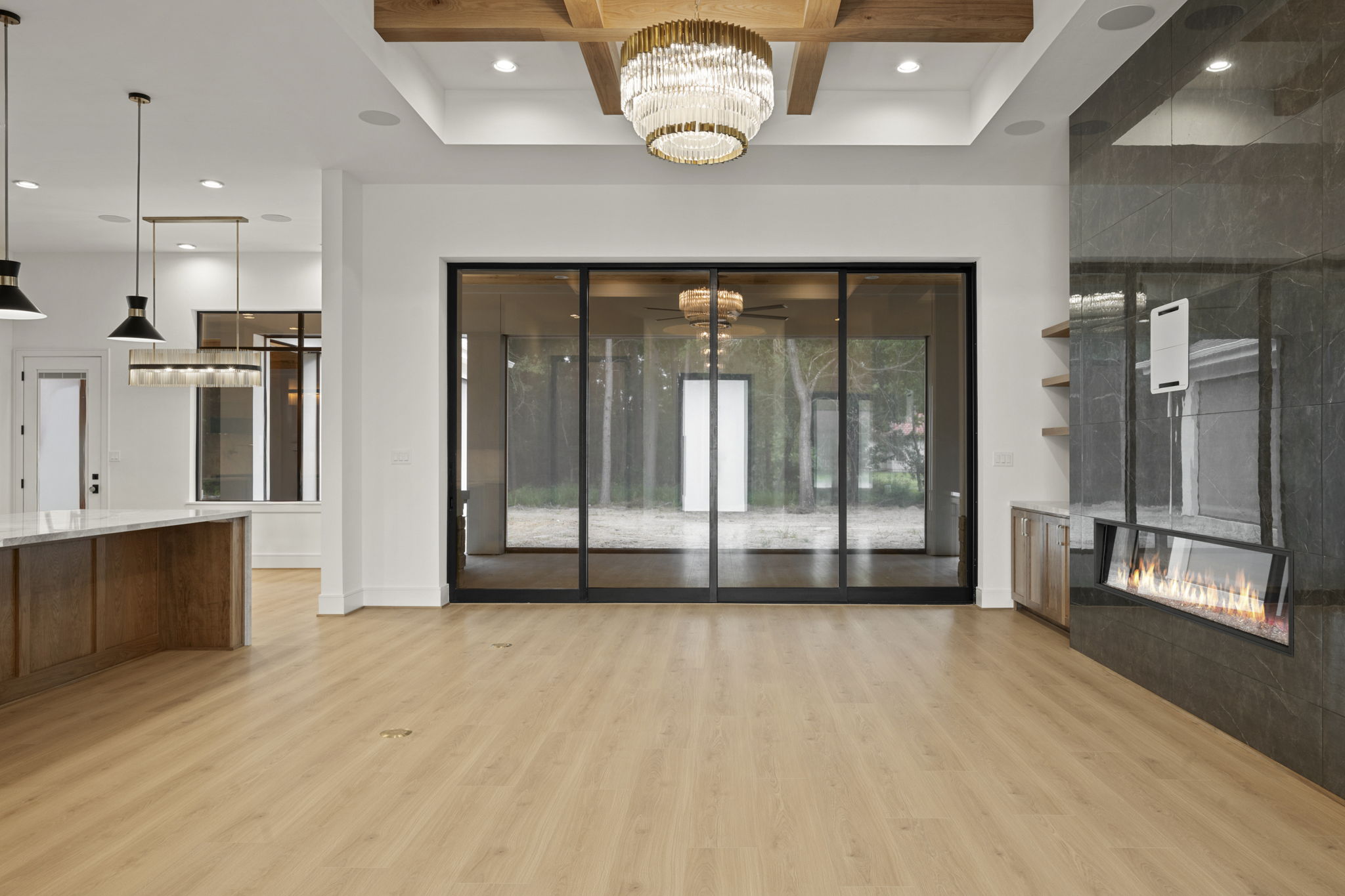 This modern custom home blends natural warmth with sleek contemporary design. The open living area showcases a striking floor-to-ceiling stone fireplace, floating shelves, and expansive glass sliders that connect seamlessly to the outdoor space. The kitchen features dual waterfall islands, rich wood cabinetry, and professional-grade appliances highlighted by bold lighting and marble surfaces. A dramatic powder bath with geometric wallpaper and a luxurious spa-like primary bath with dual showers, freestanding tub, and marble finishes complete the home’s refined aesthetic.