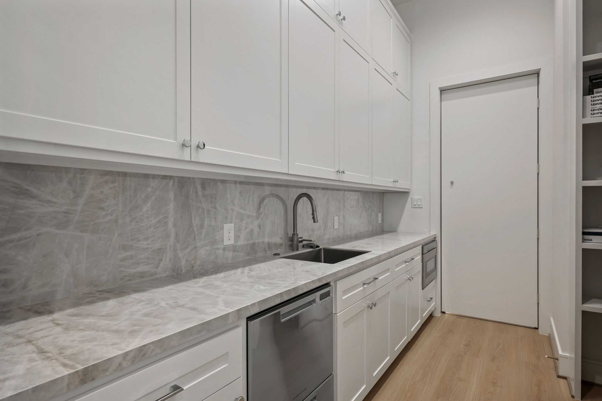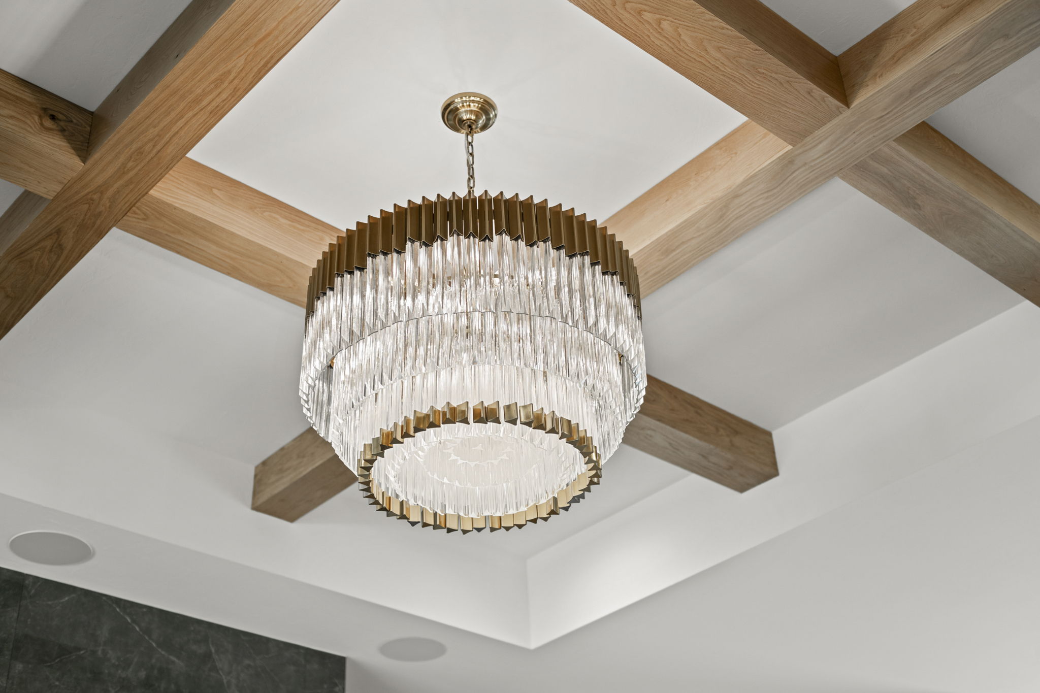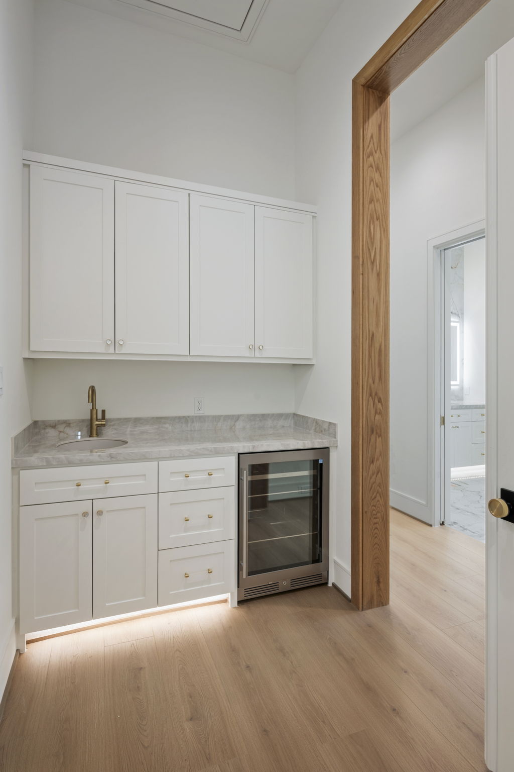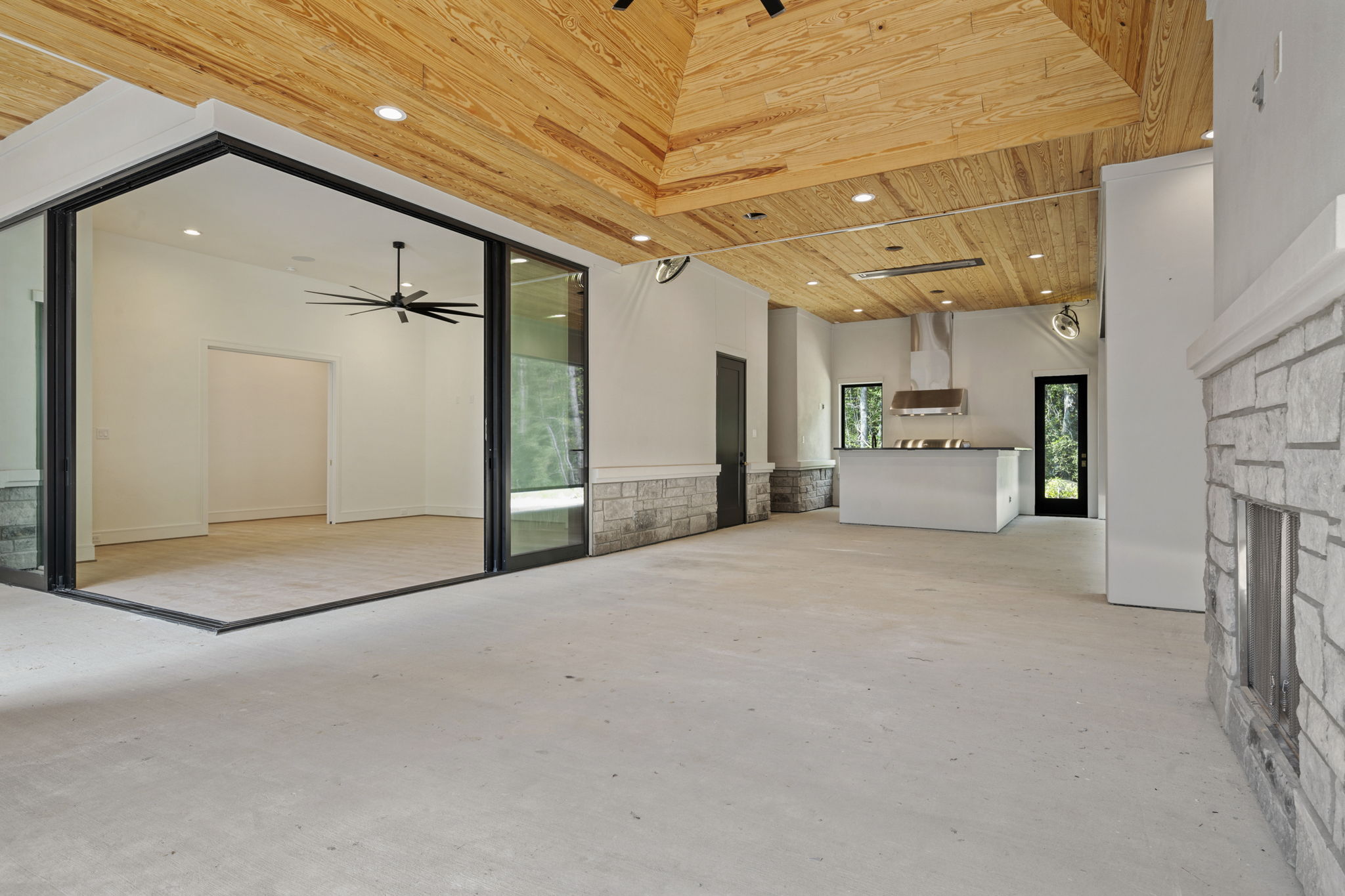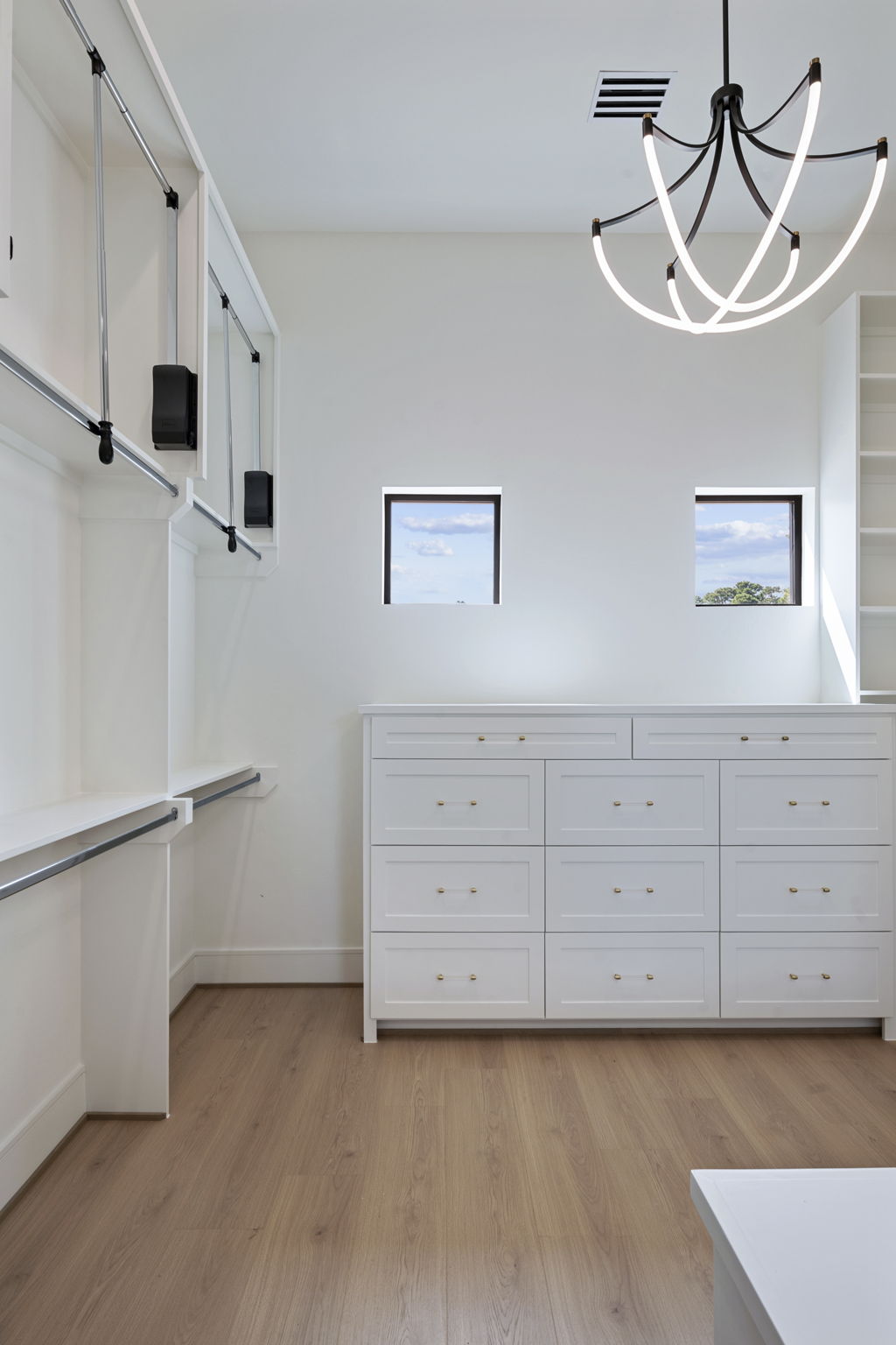 This modern custom home blends natural warmth with sleek contemporary design. The open living area showcases a striking floor-to-ceiling stone fireplace, floating shelves, and expansive glass sliders that connect seamlessly to the outdoor space. The kitchen features dual waterfall islands, rich wood cabinetry, and professional-grade appliances highlighted by bold lighting and marble surfaces. A dramatic powder bath with geometric wallpaper and a luxurious spa-like primary bath with dual showers, freestanding tub, and marble finishes complete the home’s refined aesthetic.