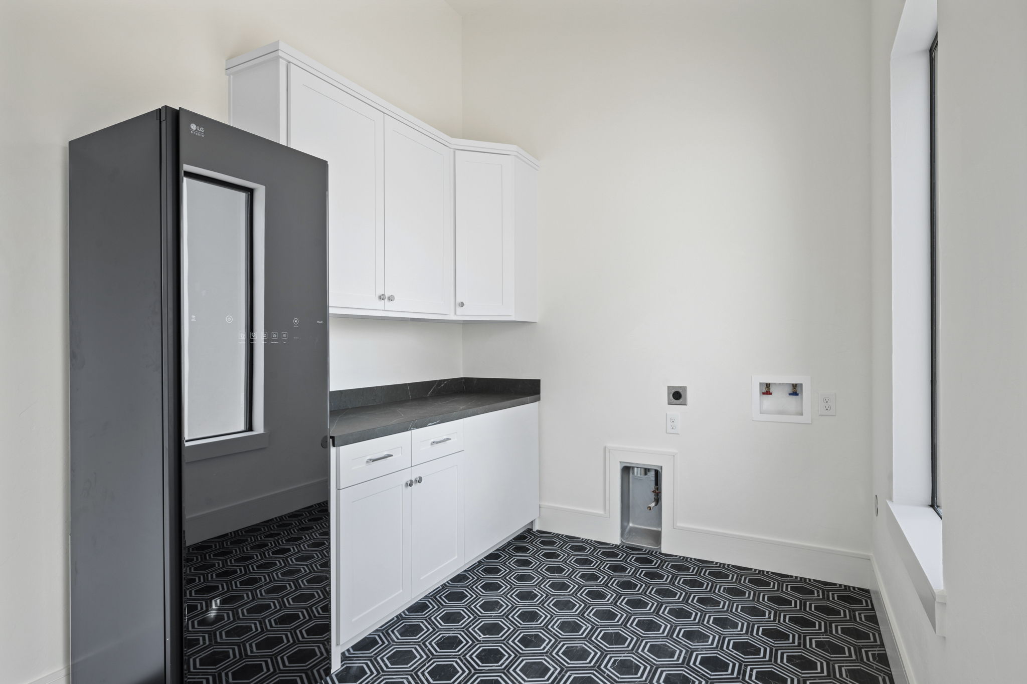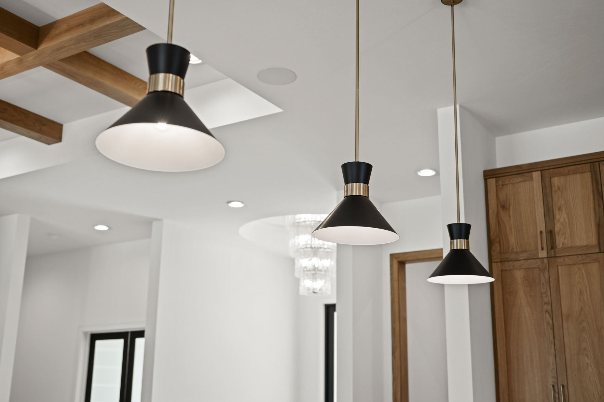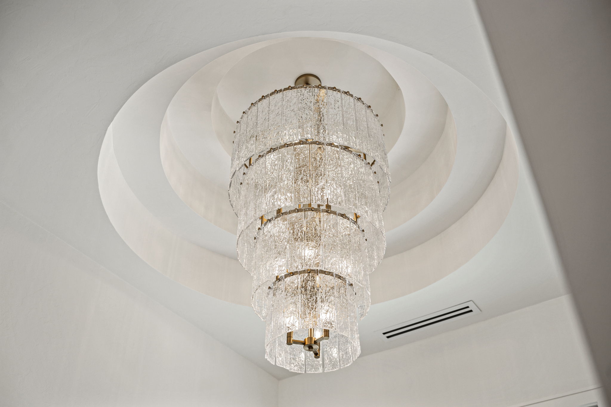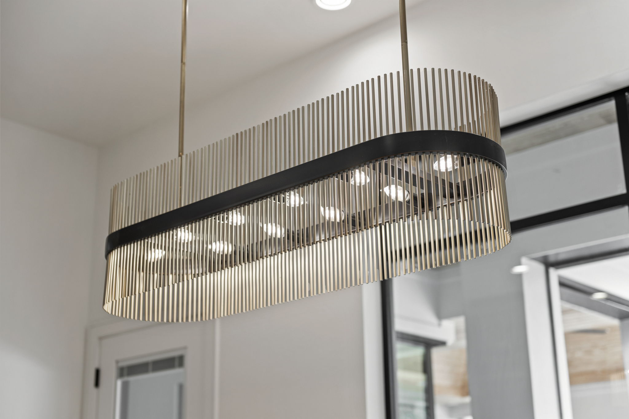 This modern custom home blends natural warmth with sleek contemporary design. The open living area showcases a striking floor-to-ceiling stone fireplace, floating shelves, and expansive glass sliders that connect seamlessly to the outdoor space. The kitchen features dual waterfall islands, rich wood cabinetry, and professional-grade appliances highlighted by bold lighting and marble surfaces. A dramatic powder bath with geometric wallpaper and a luxurious spa-like primary bath with dual showers, freestanding tub, and marble finishes complete the home’s refined aesthetic.