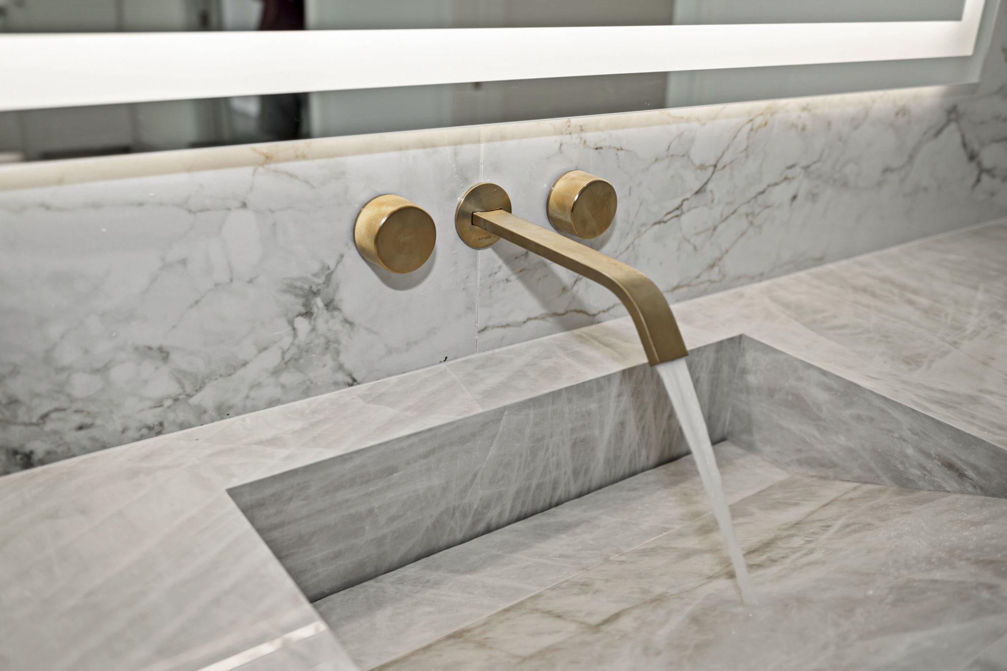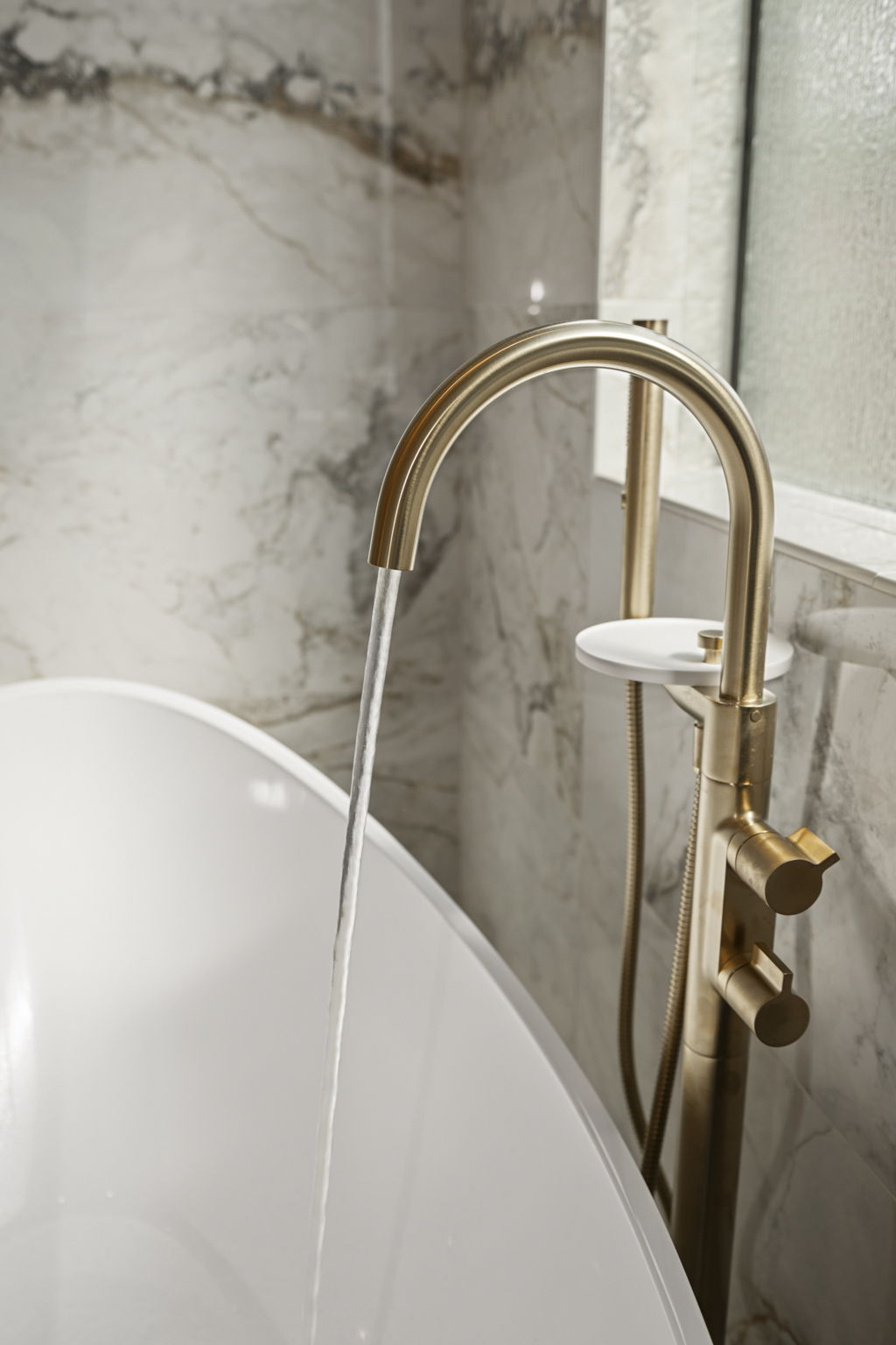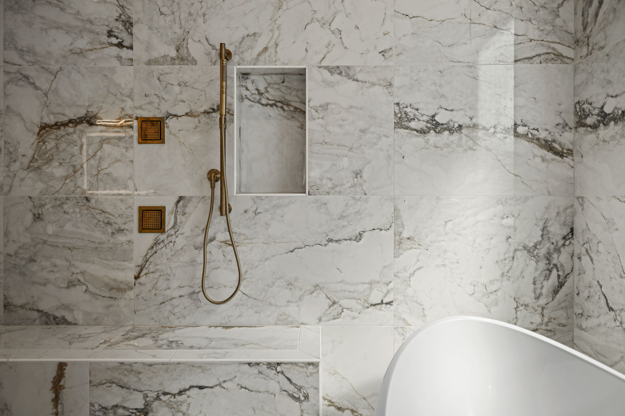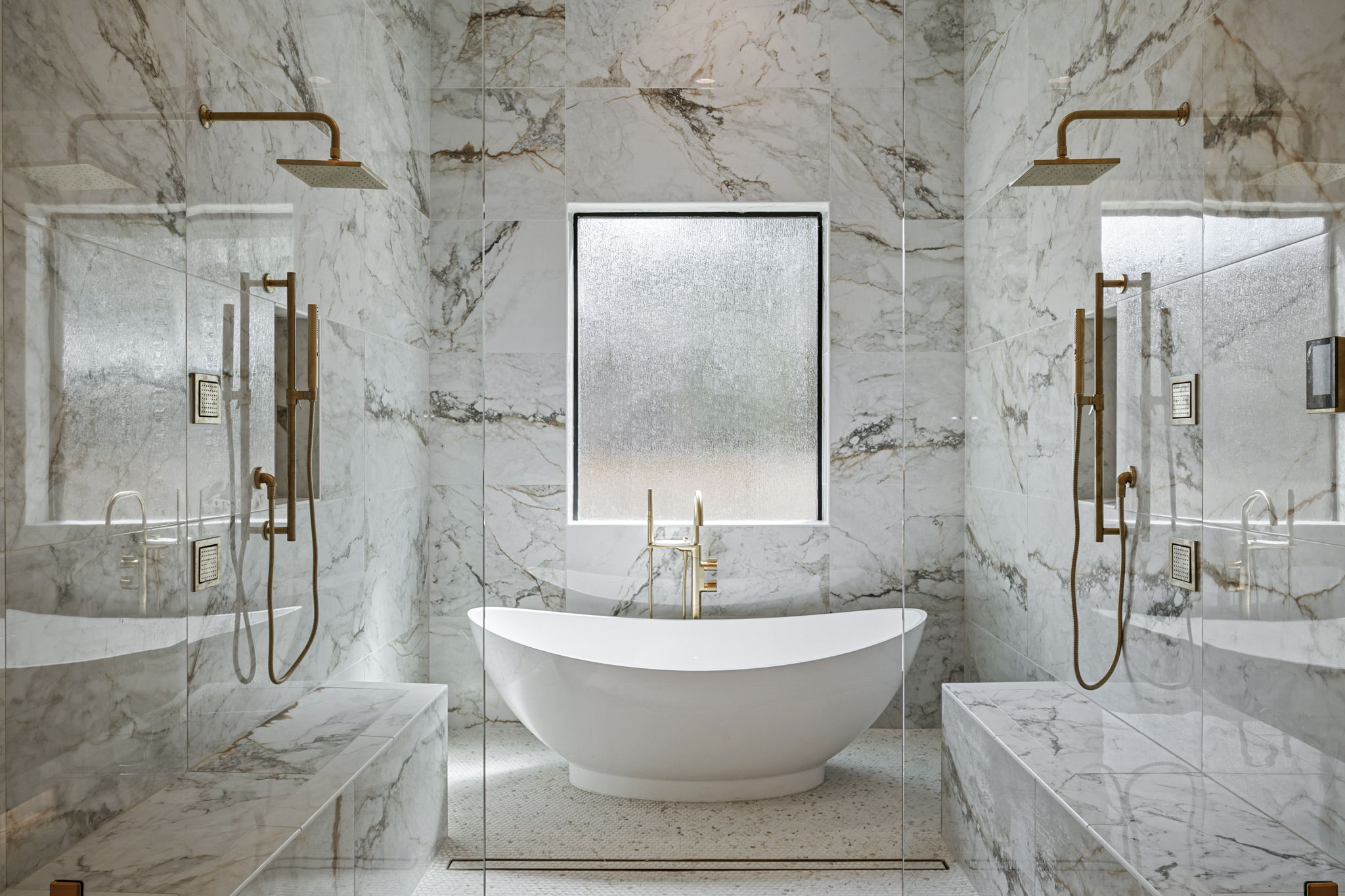 Luxurious bathroom with dual showers, freestanding tub, and marble finishes