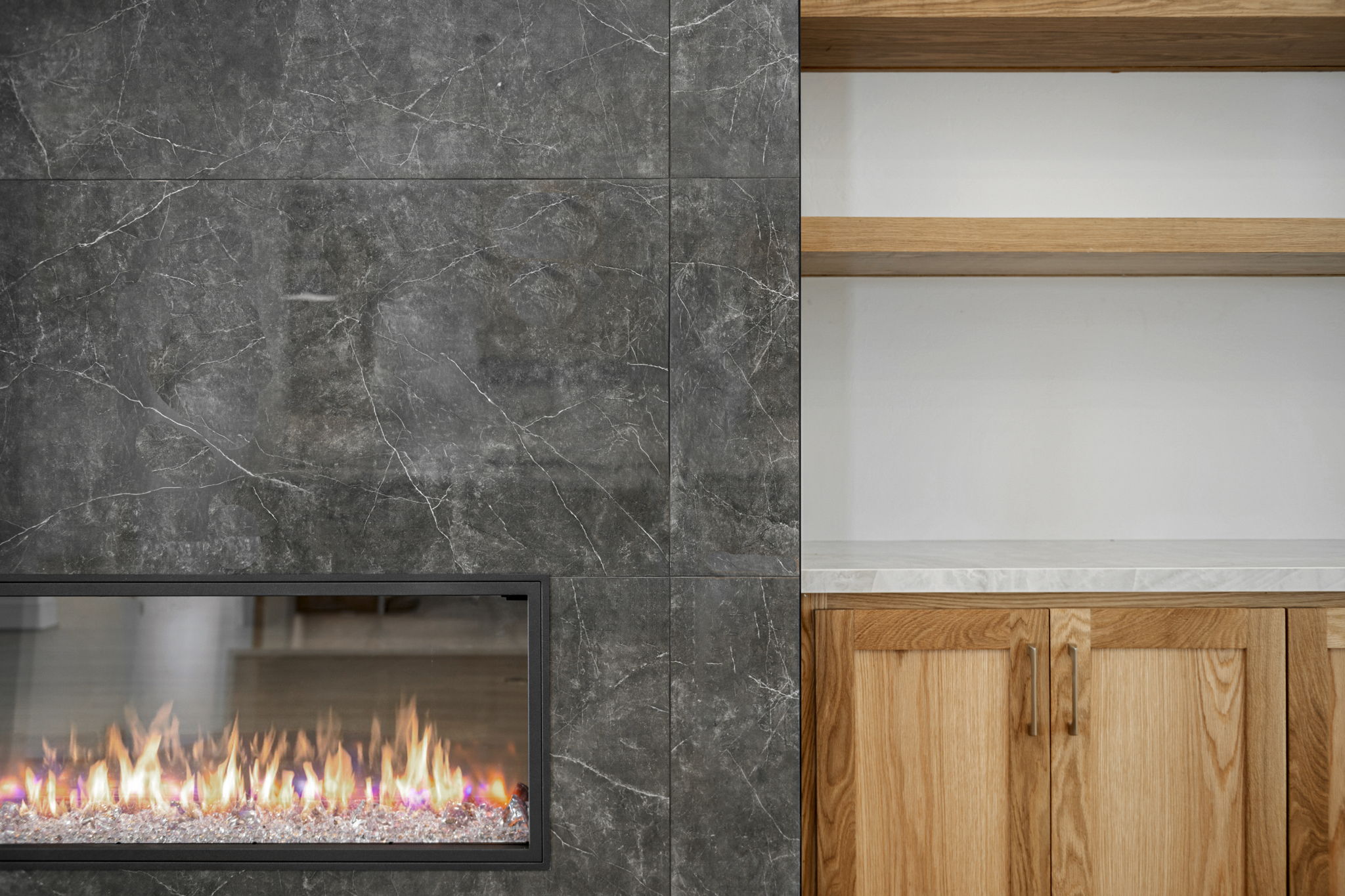 Floor-to-ceiling stone fireplace with floating shelves in the open living area