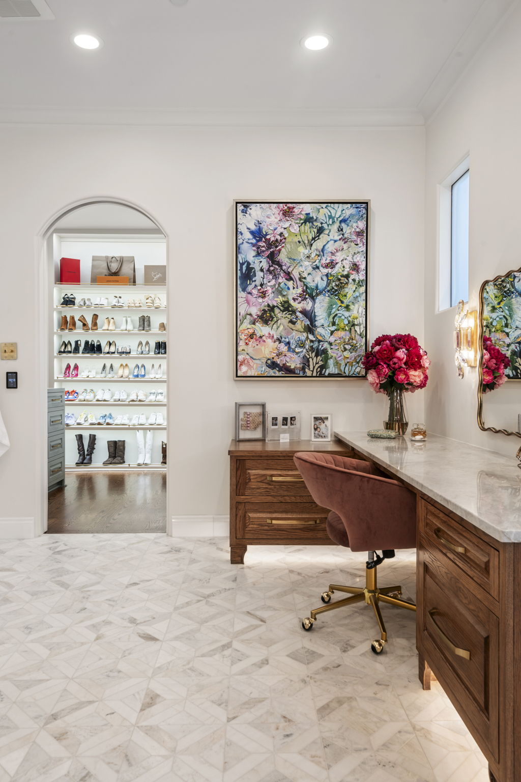 - LED-Lit Closet: Built-in shelves, shoe towers, and full LED lighting throughout