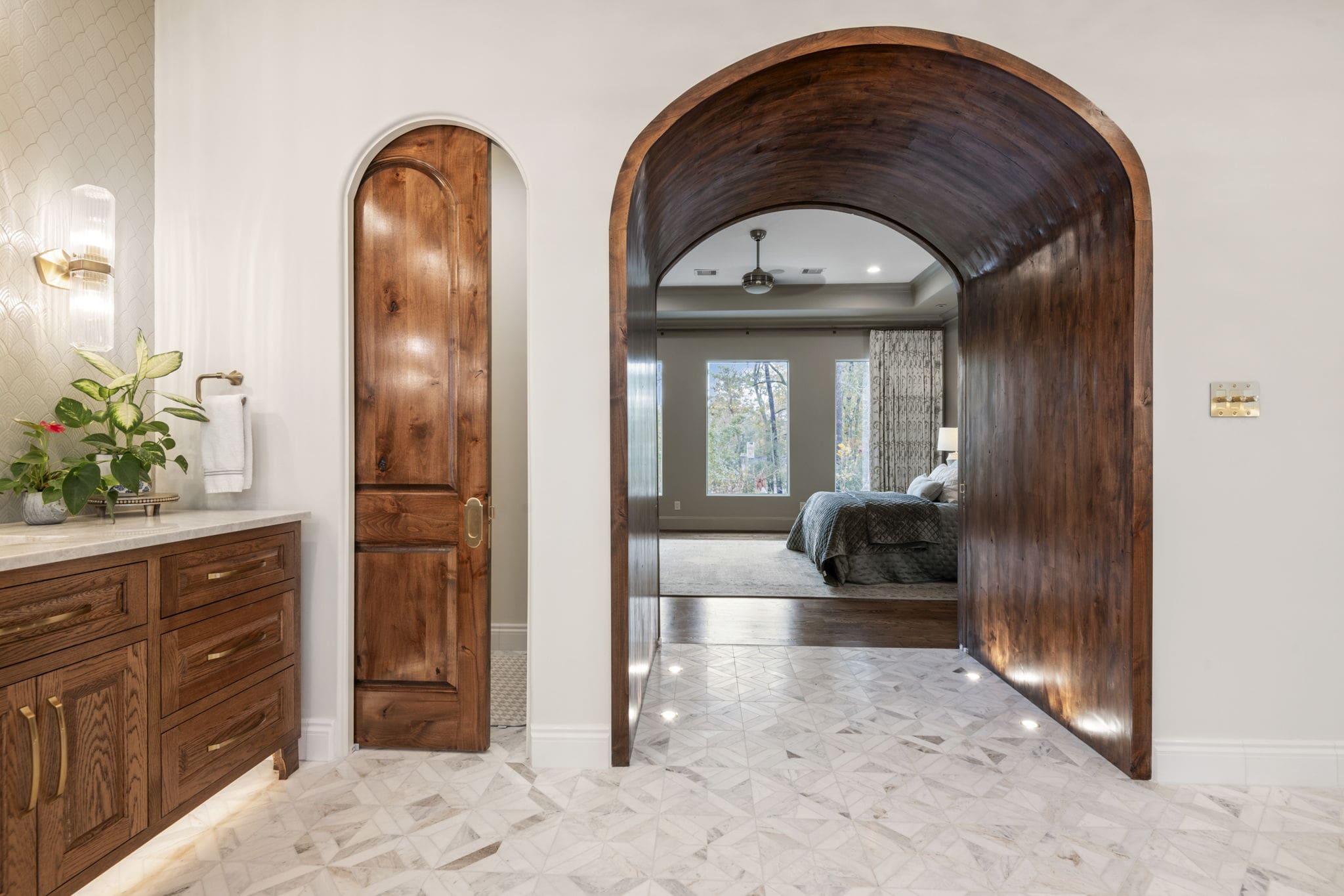 - Grand Entrance: Beautiful arched alder wood doors that slide into the wall