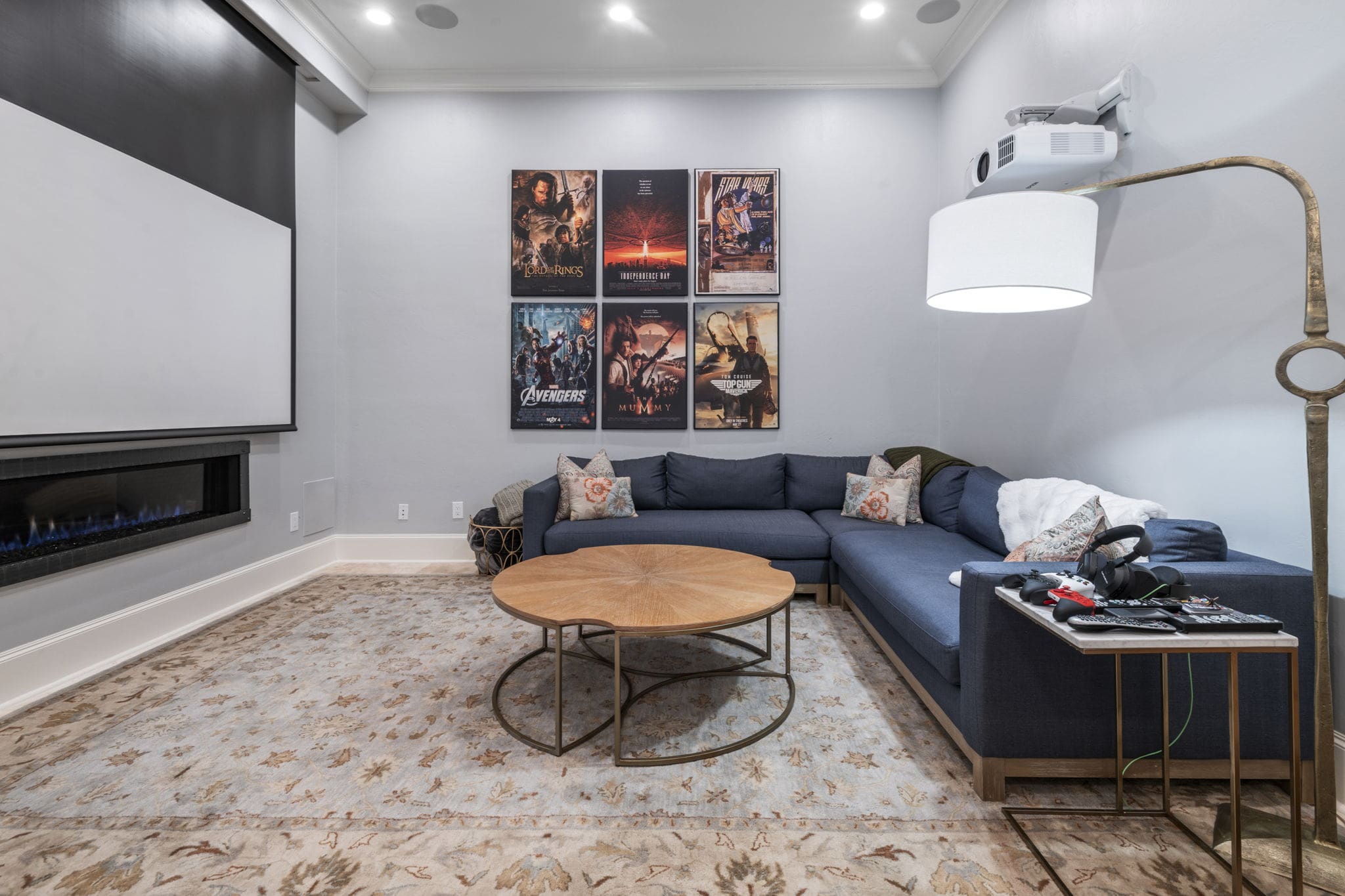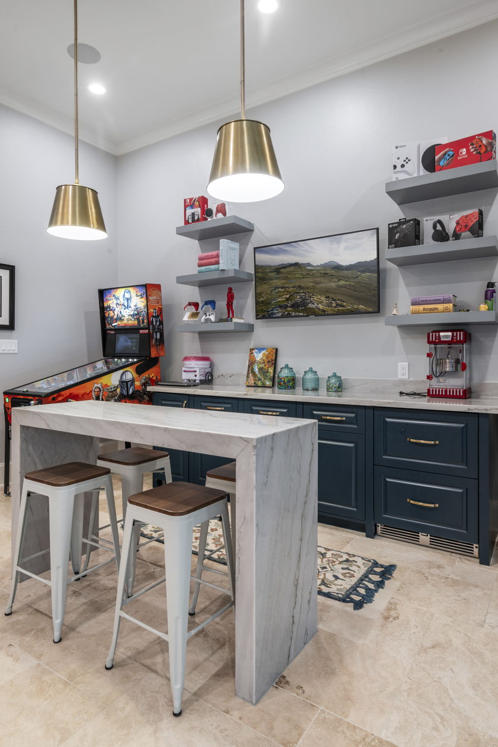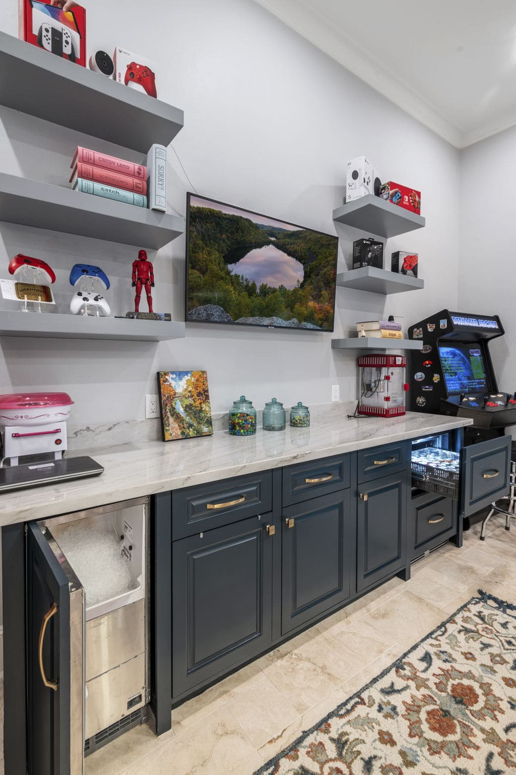 - Beverage Bar: Built-in bar with custom cabinets and a mini fridge underneath