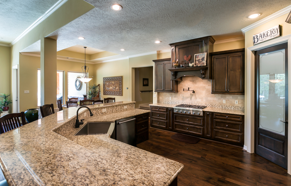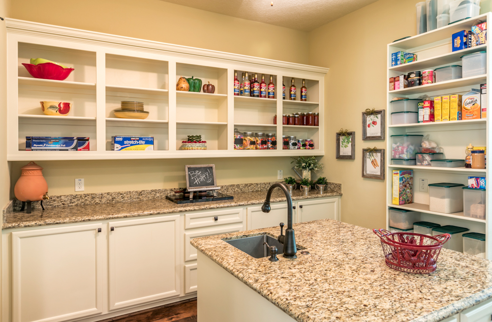 Granite counters, custom cabinets, gas stove with a pot filler, plus a walk-in pantry with prep sink and open shelves