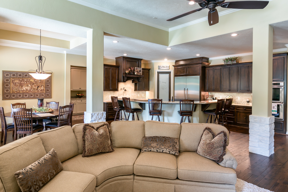 Kitchen, dining, and living areas all flow together with lots of bar seating and wood floors