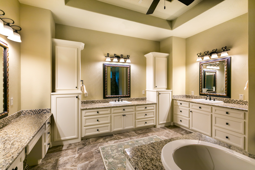 Tray ceiling with decorative inlay, soaking tub, double sinks, extra storage, and a spot for makeup