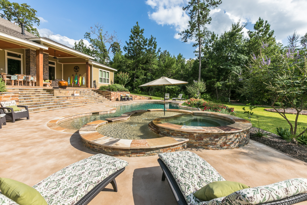 Sunken spa, beach-style entry, curved steps, and lush plants all around